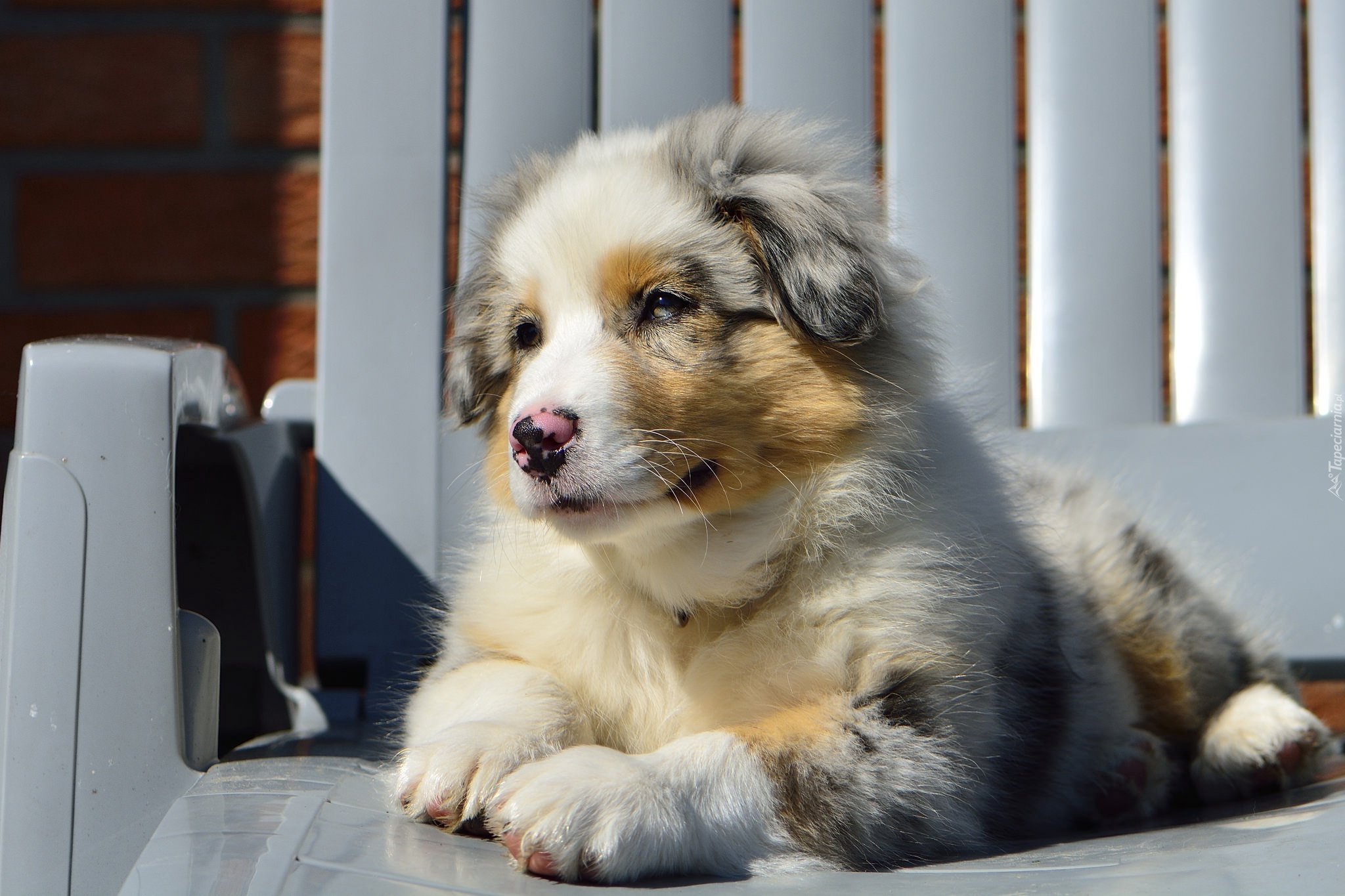 Edytor tapety: Owczarek australijski na ogrodowym krzesełku
