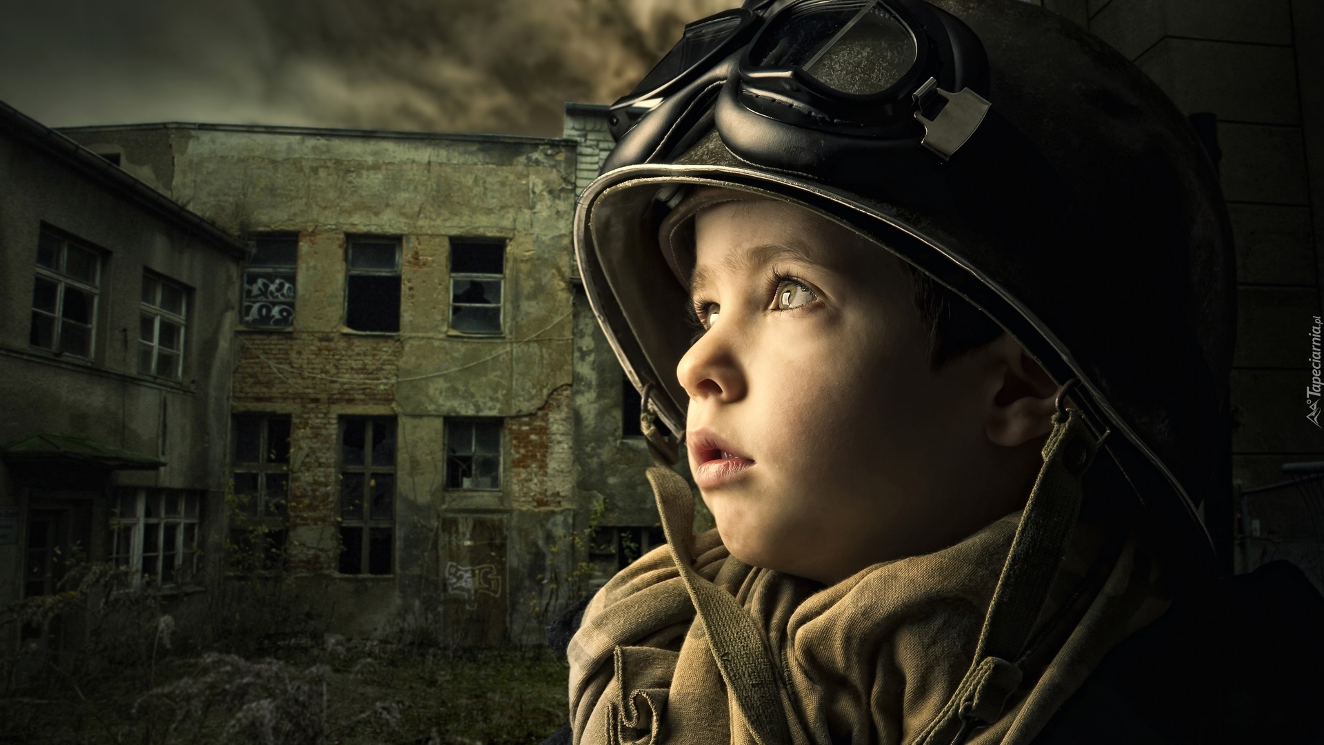 Edytor tapety: Dziecko w hełmie na tle ruin