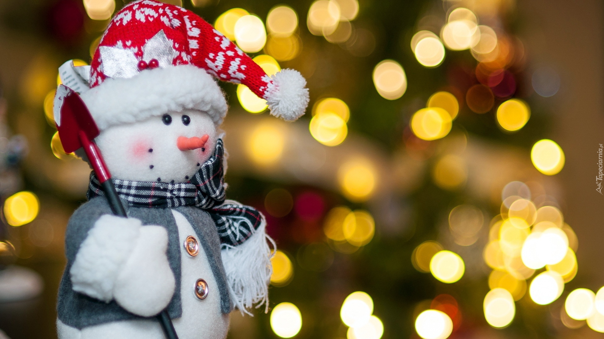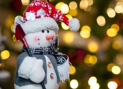 Edytor tapety: Bałwanek w świątecznym ubranku na tle światełek