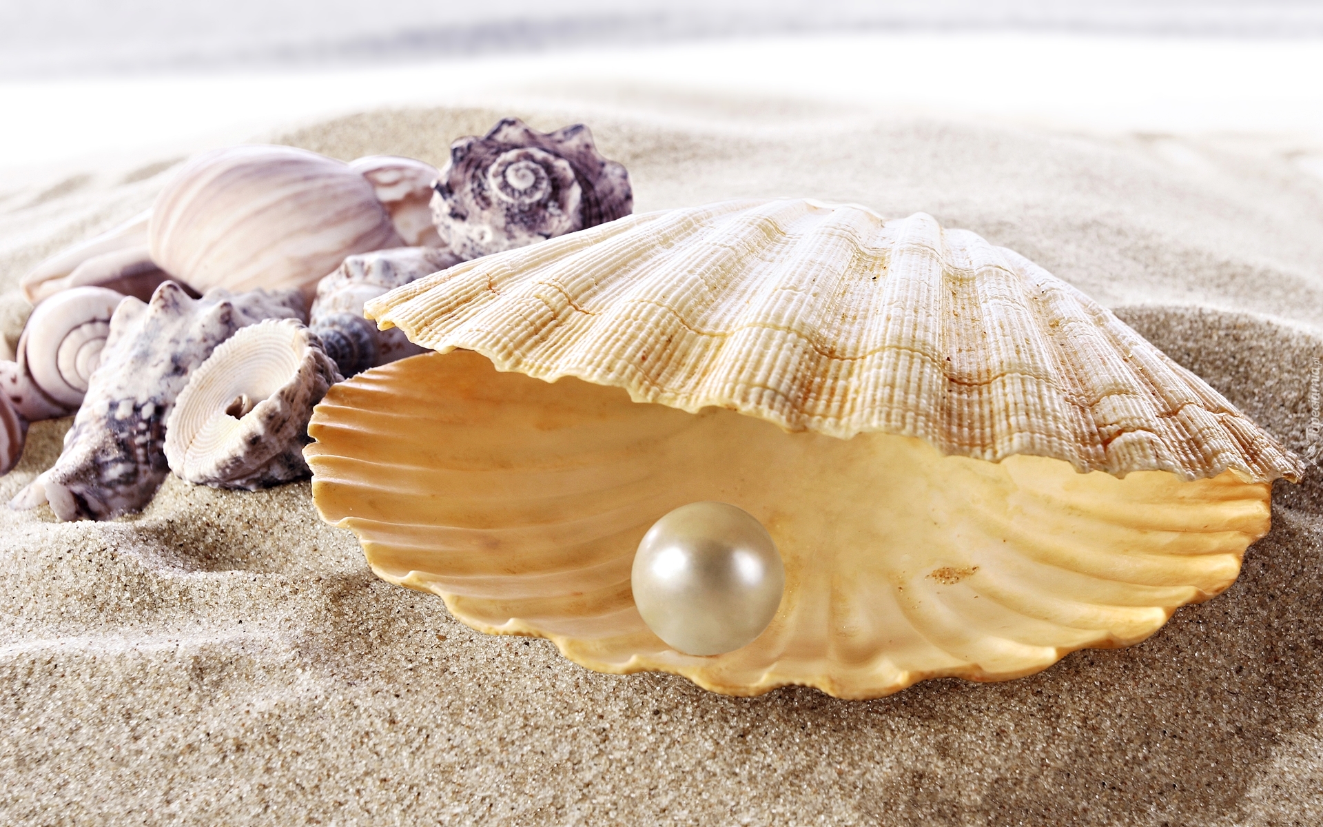 Edytor tapety: Muszla z perłą i małe muszelki na piasku