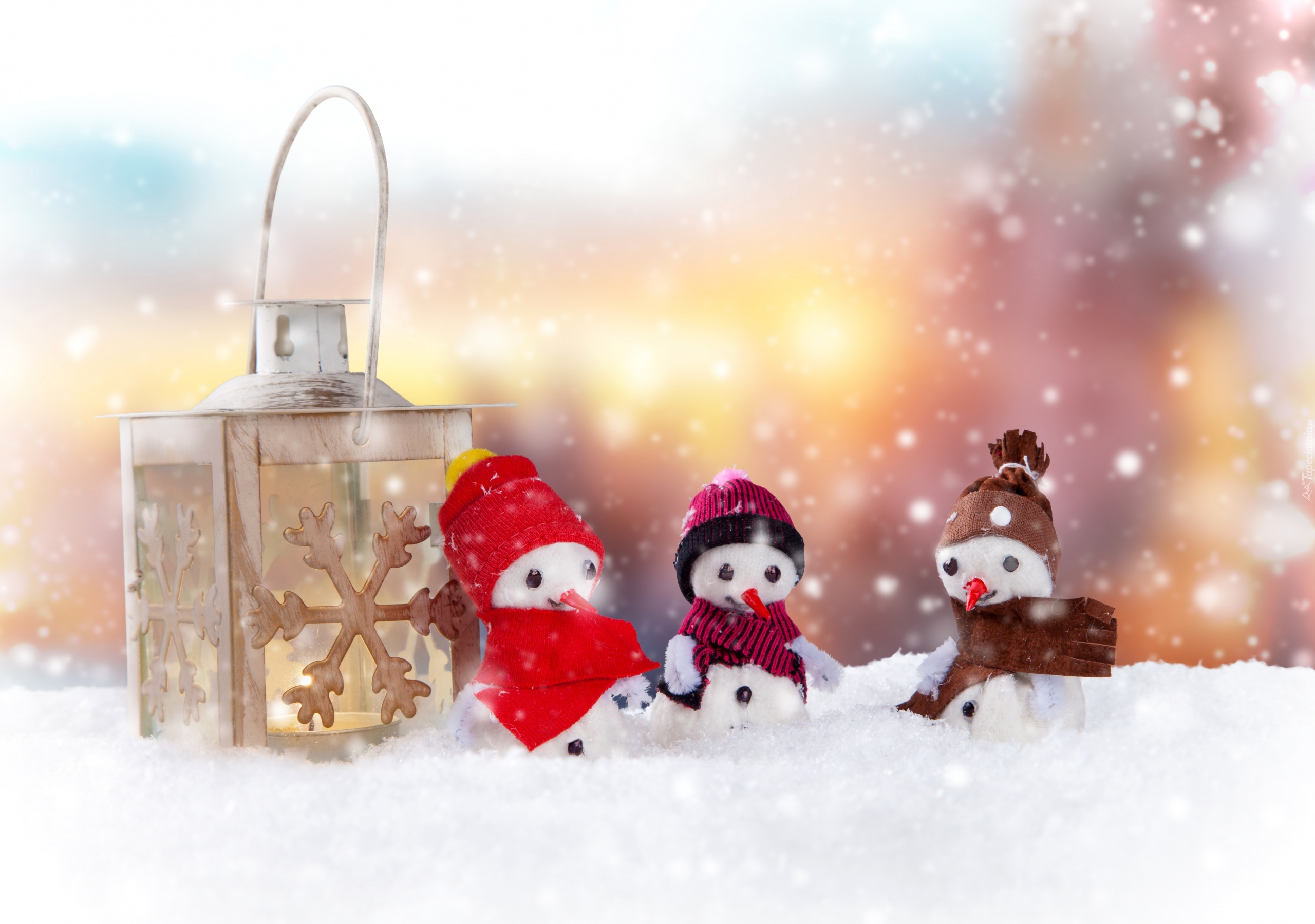 Edytor tapety: Małe bałwanki w ubrankach z lampionem na śniegu