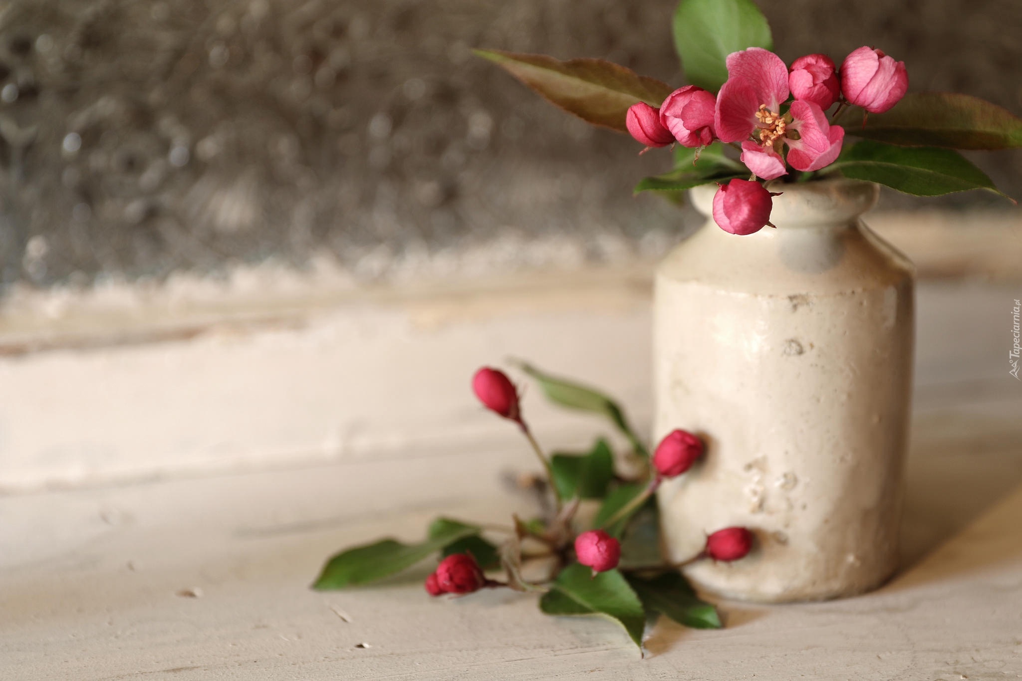 Edytor tapety: Różowe kwiaty w starym stylowym wazoniku