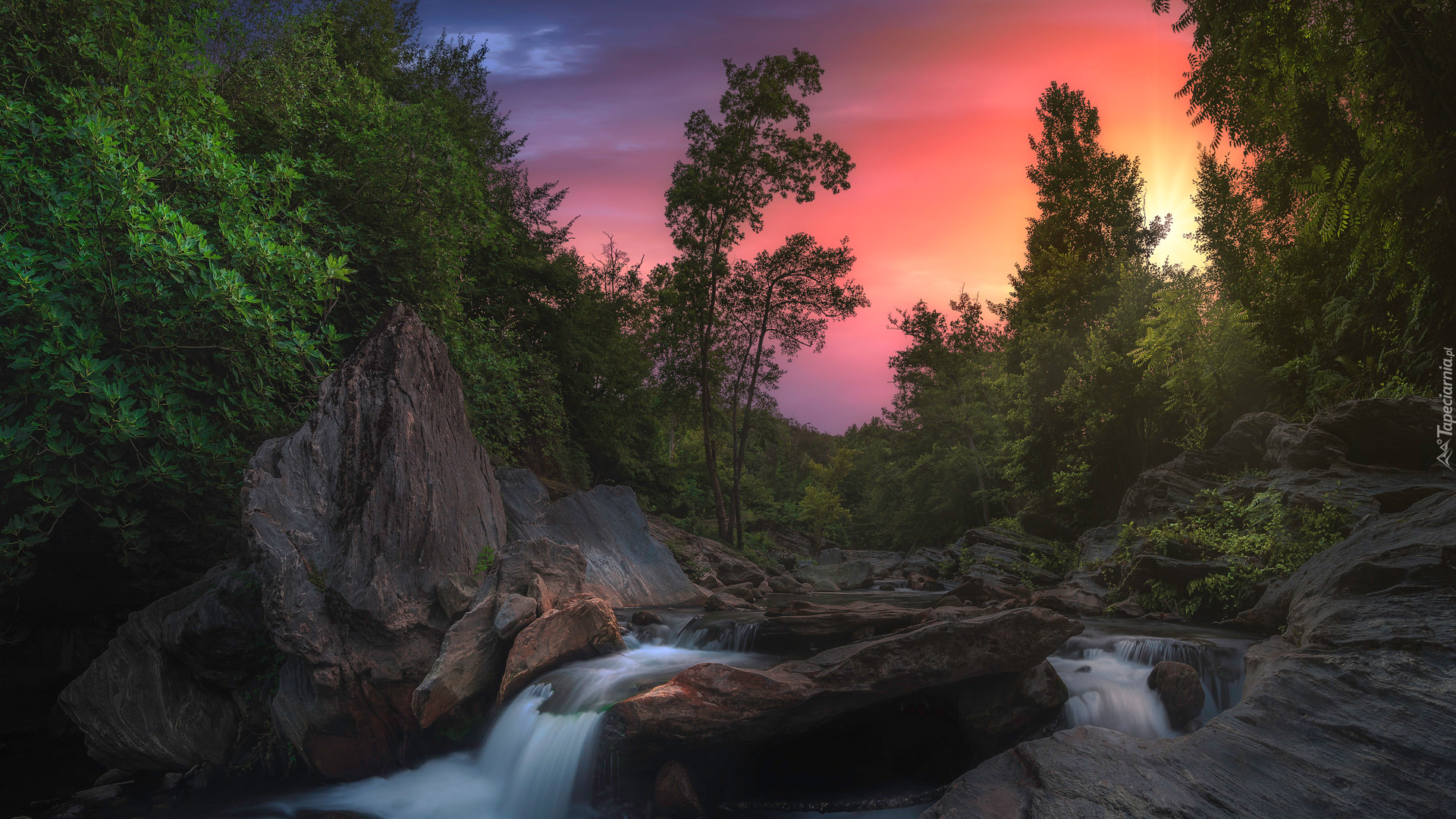 Edytor tapety: Rzeka przy skałach w lesie o zachodzie słońca