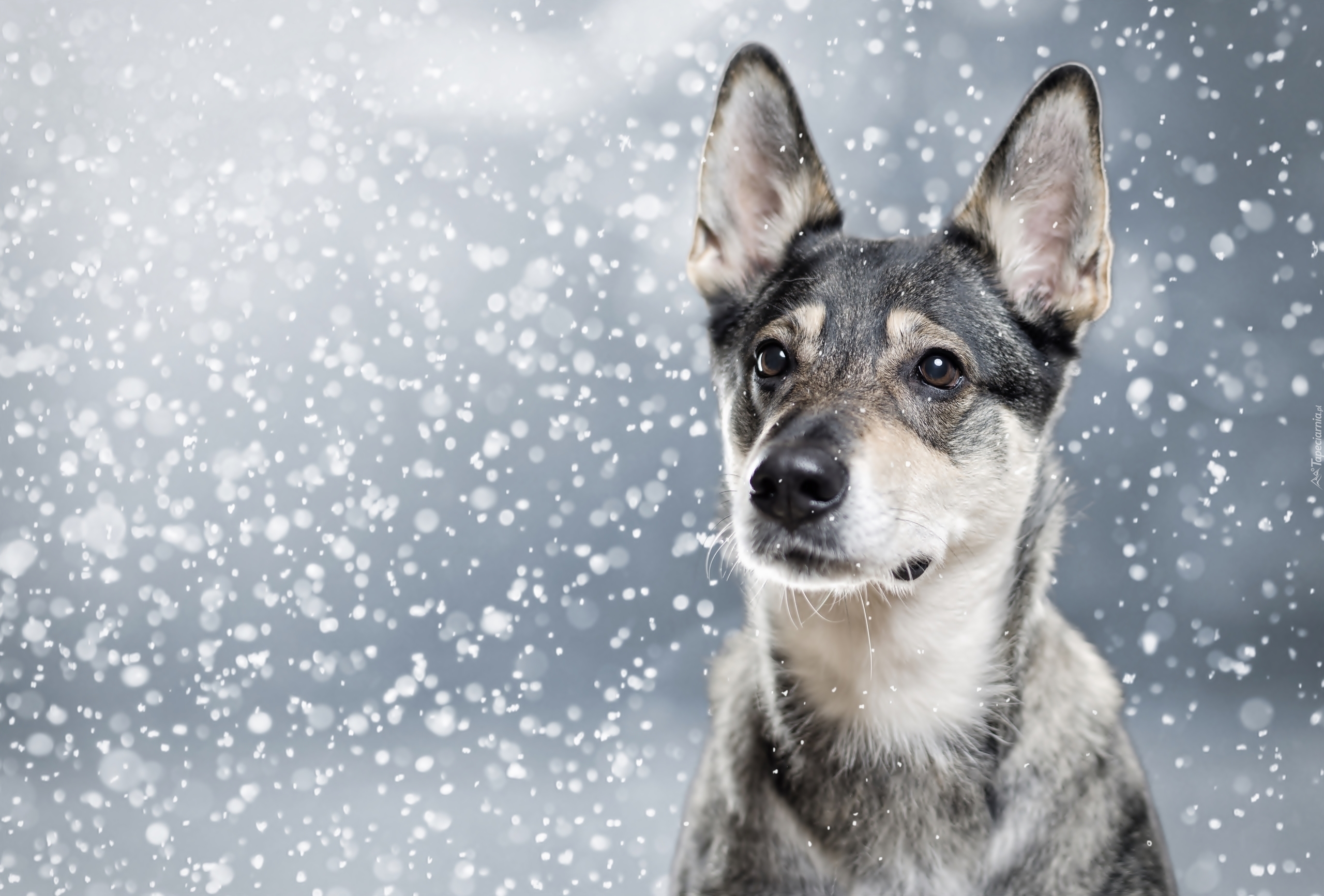 Edytor tapety: Pies wśród płatków padającego śniegu