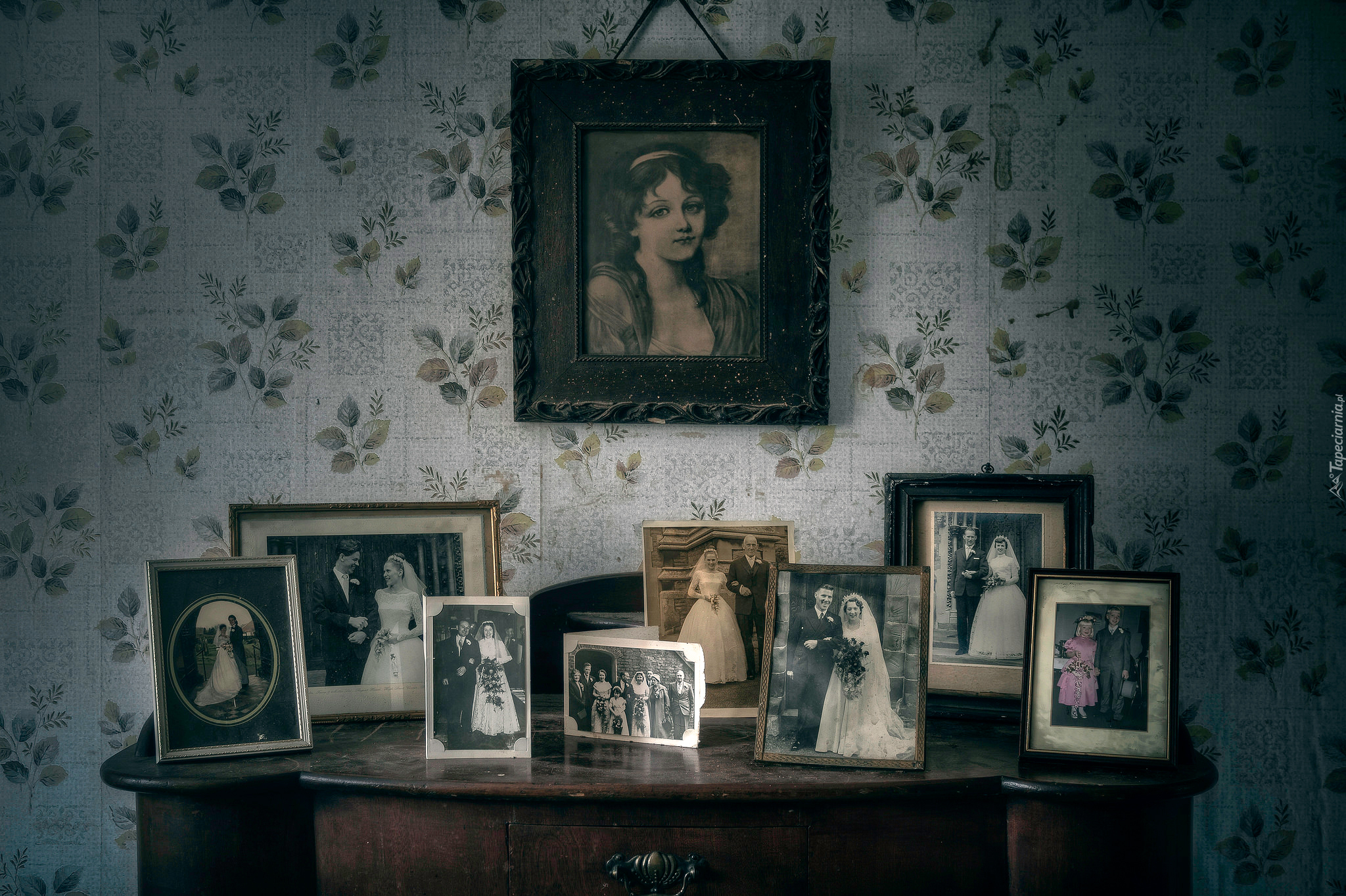 Edytor tapety: Stare pamiątkowe zdjęcia na komodzie