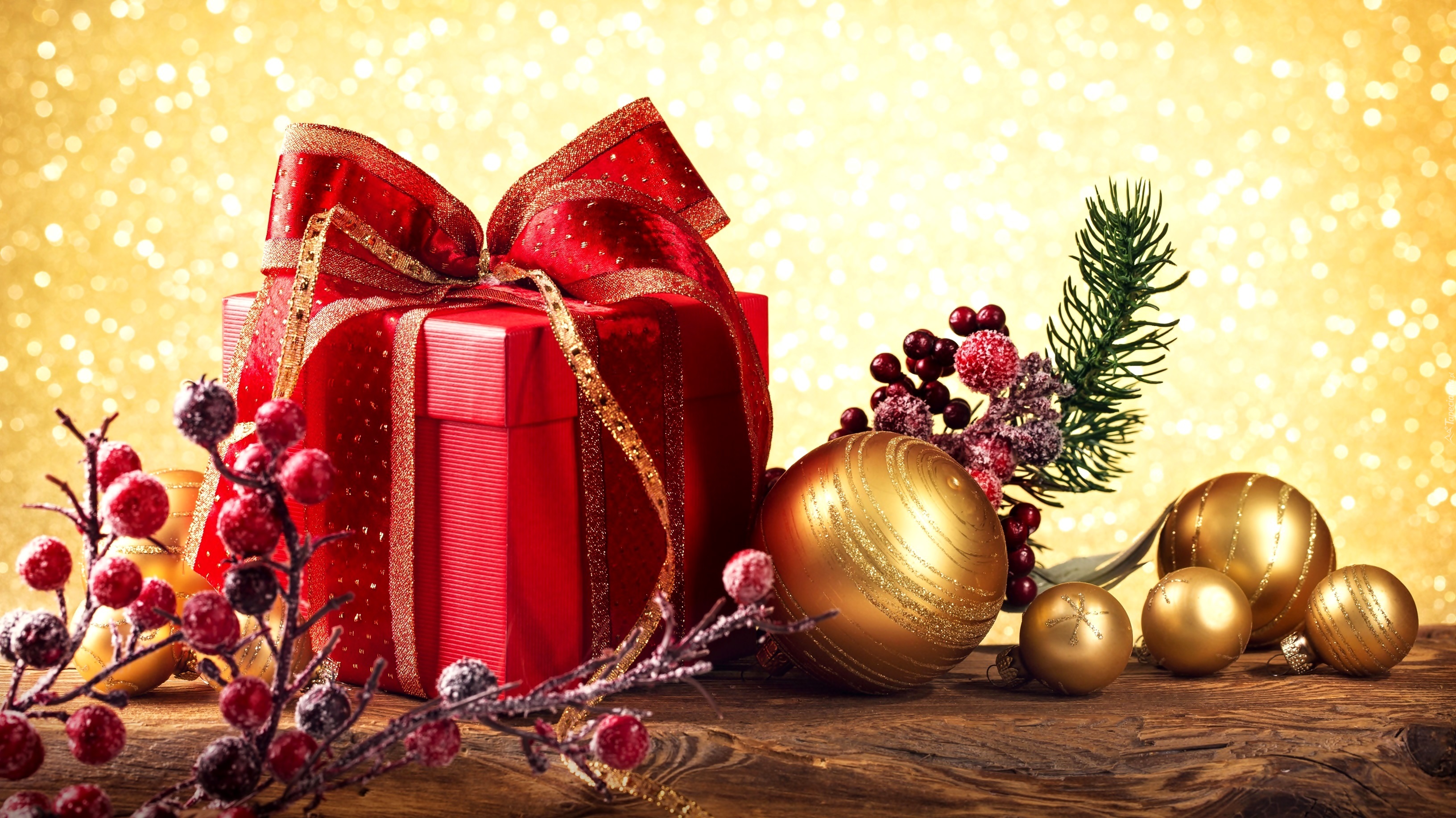 Edytor tapety: Świąteczny prezent w dekoracji z bombkami i gałązkami