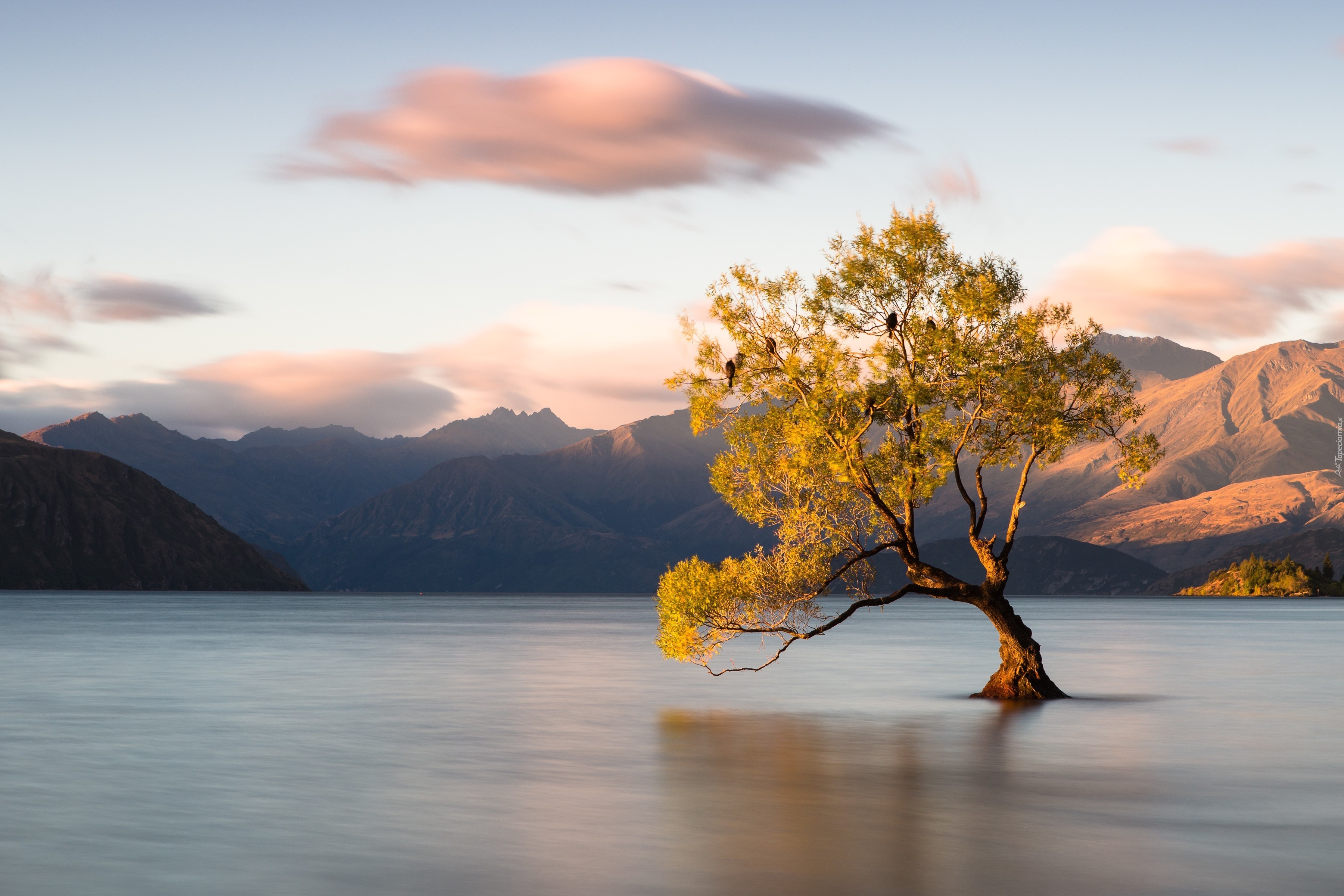 Edytor tapety: Pochylone drzewo na środku jeziora