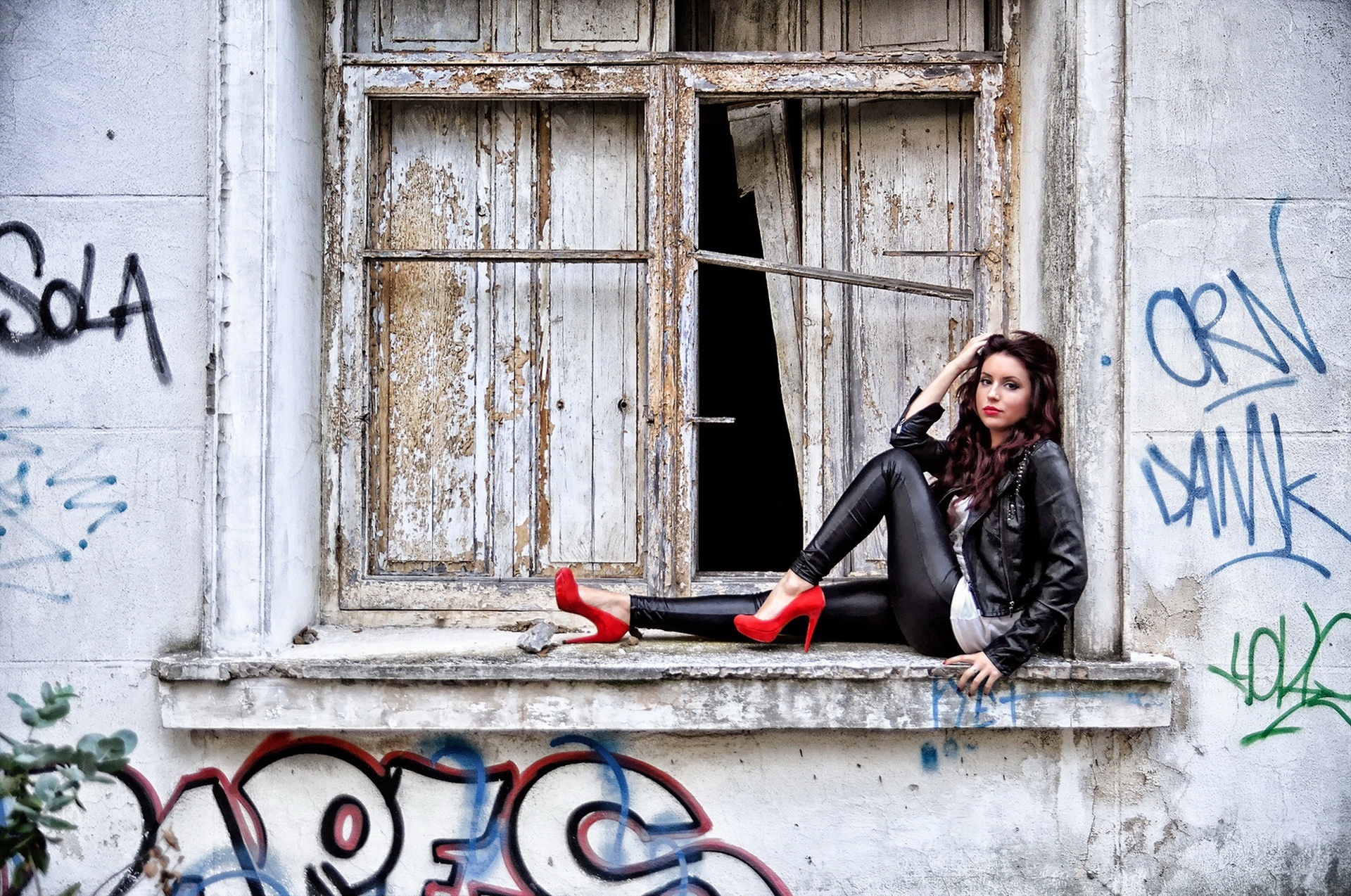Edytor tapety: Kobieta w skórzanym stroju i czerwonych szpilkach