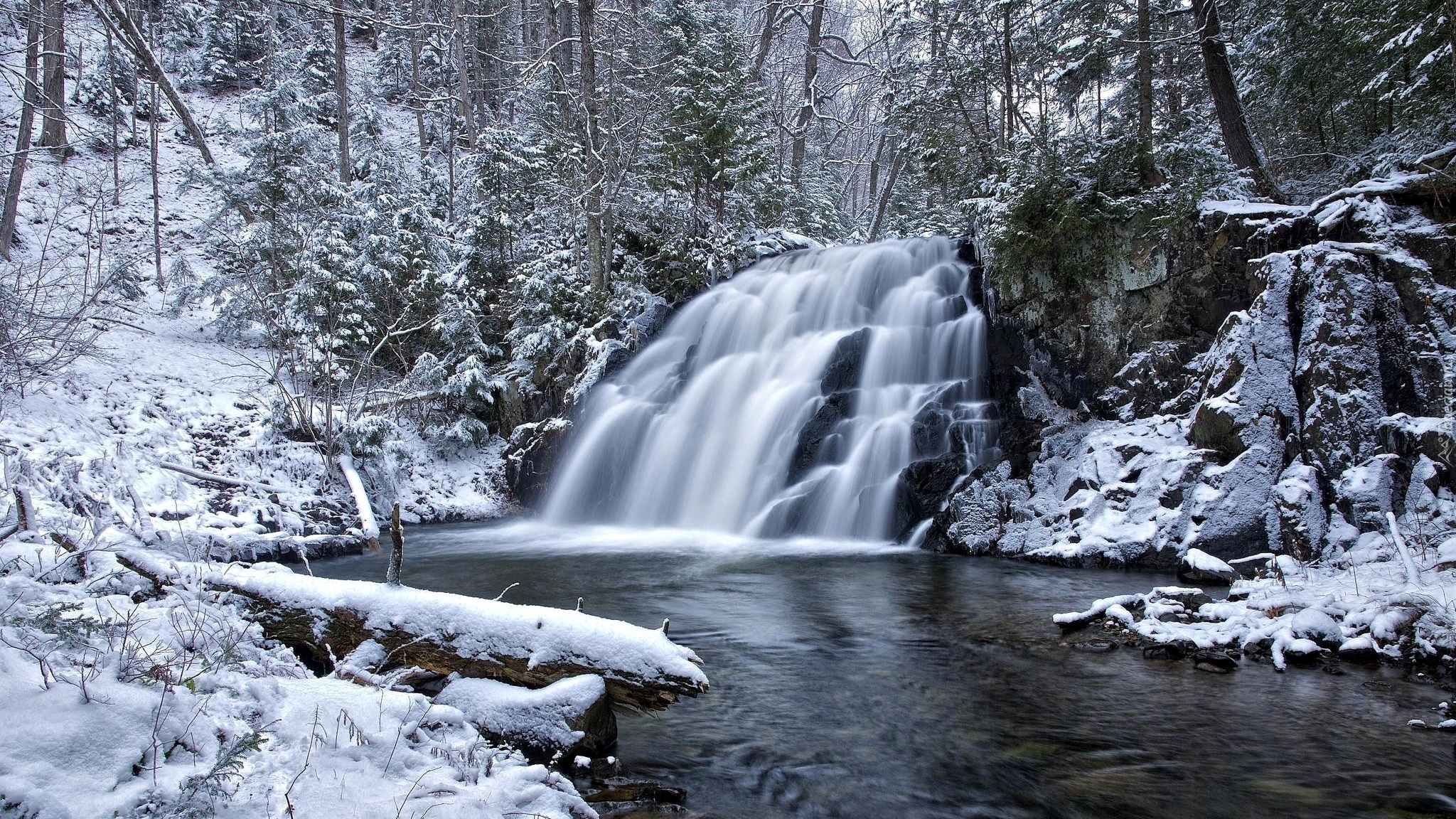Edytor tapety: Wodospad wpadający do rzeki w zimowym lesie