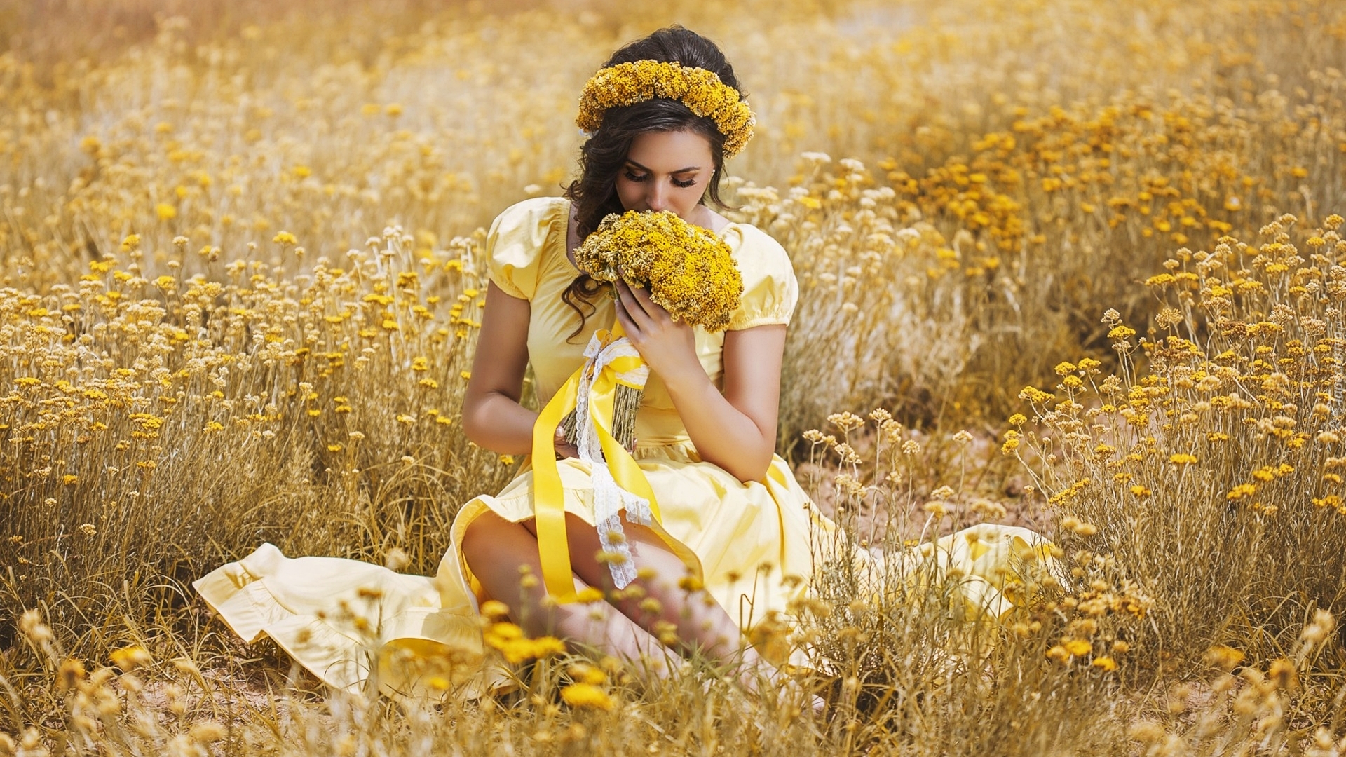 Edytor tapety: Kobieta na kwiecistej łące z bukietem w dłoni