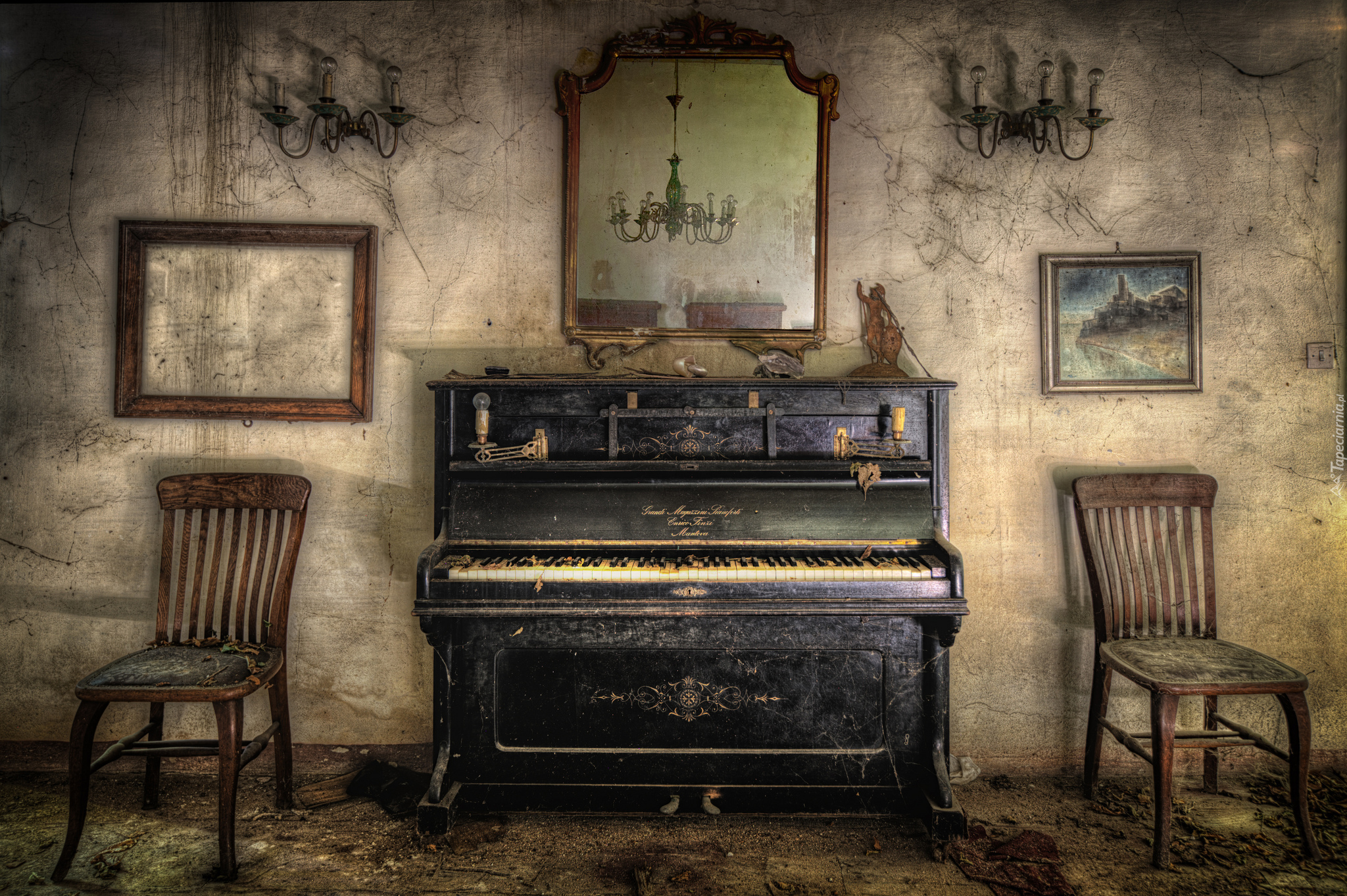 Edytor tapety: Stare pianino i krzesła w zrujnowanym wnętrzu