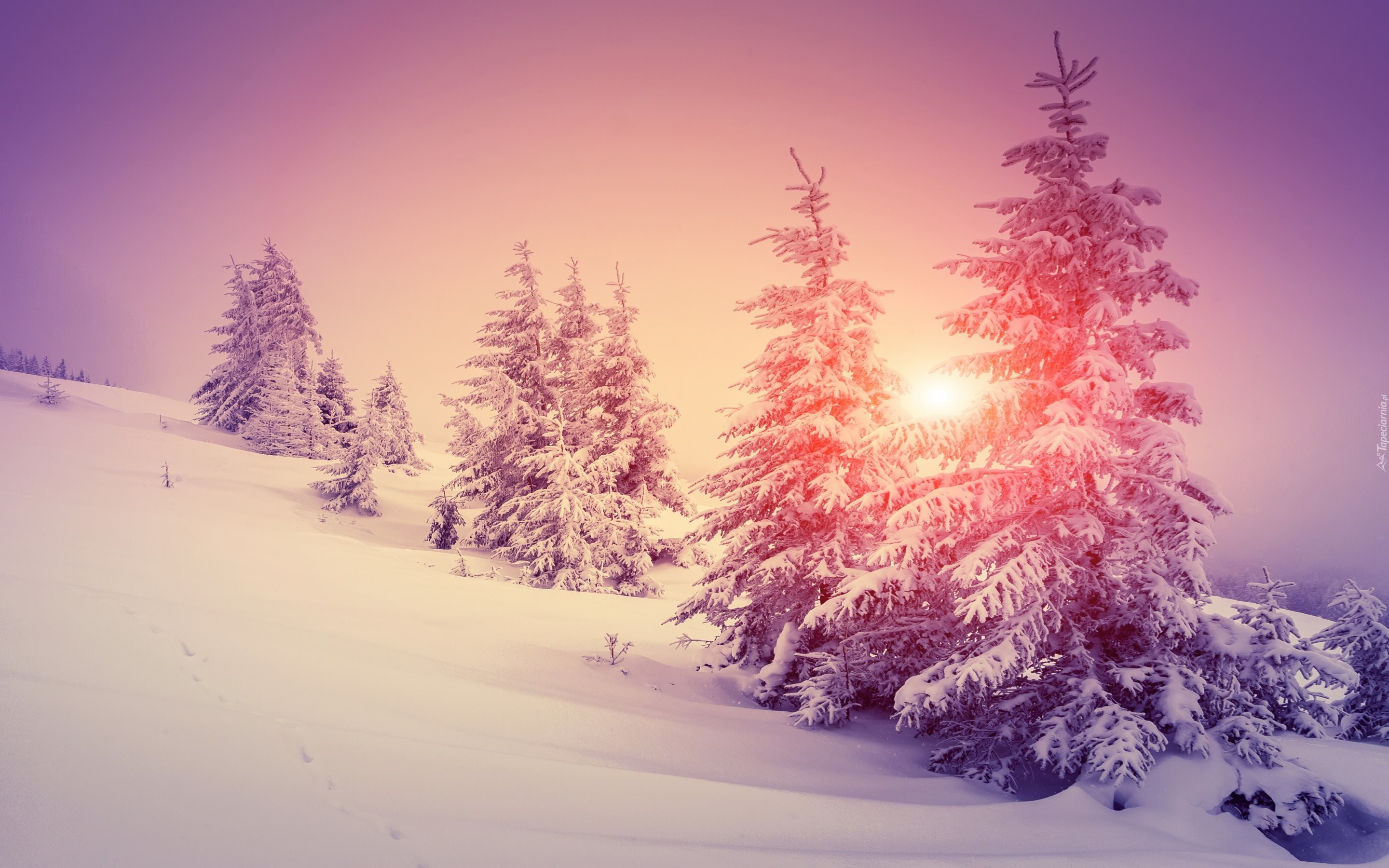 Edytor tapety: Ośnieżone drzewa na stoku w blasku zachodzącego słońca