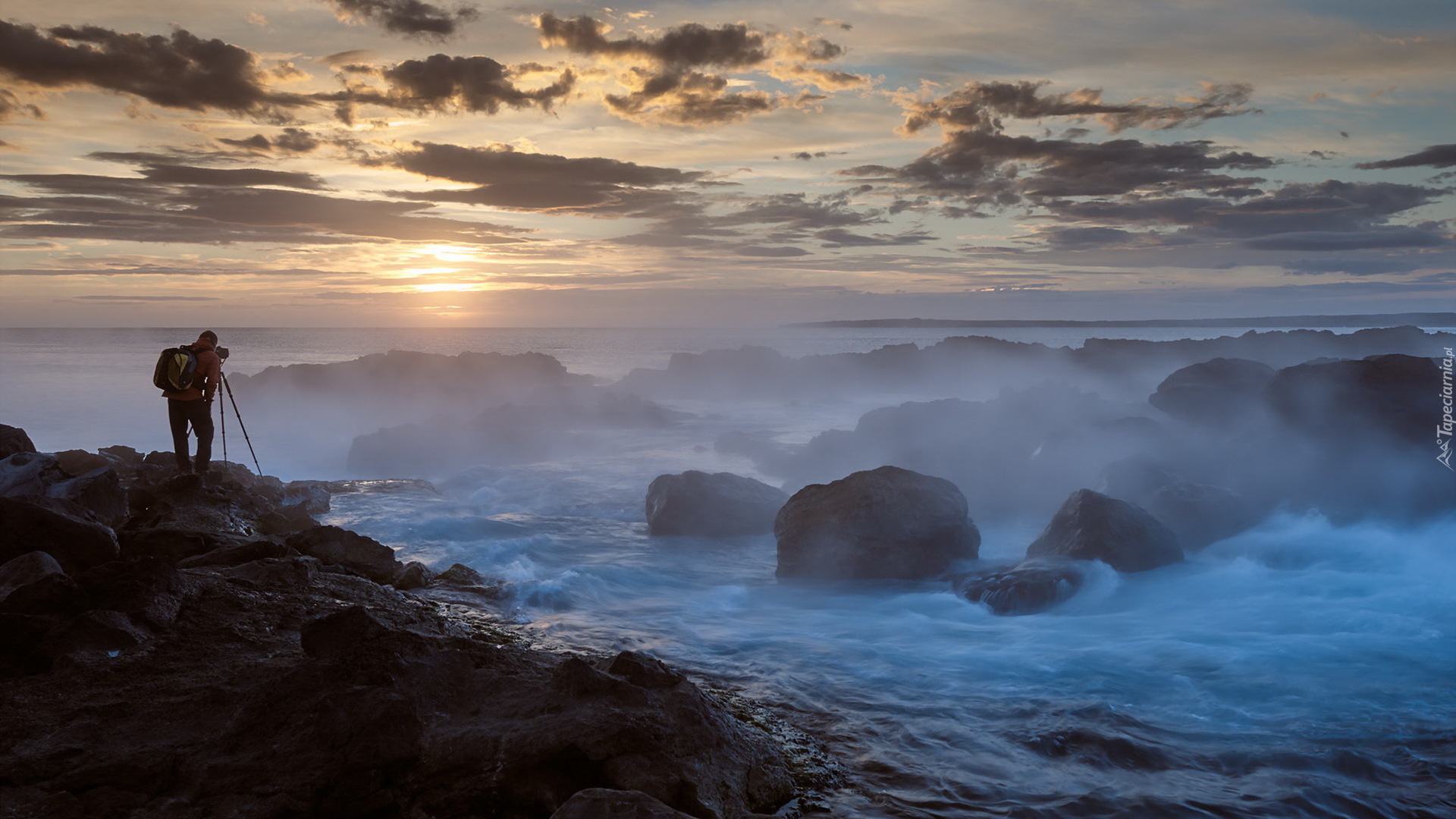 Edytor tapety: Fotograf nad wzburzonym morzem o świcie