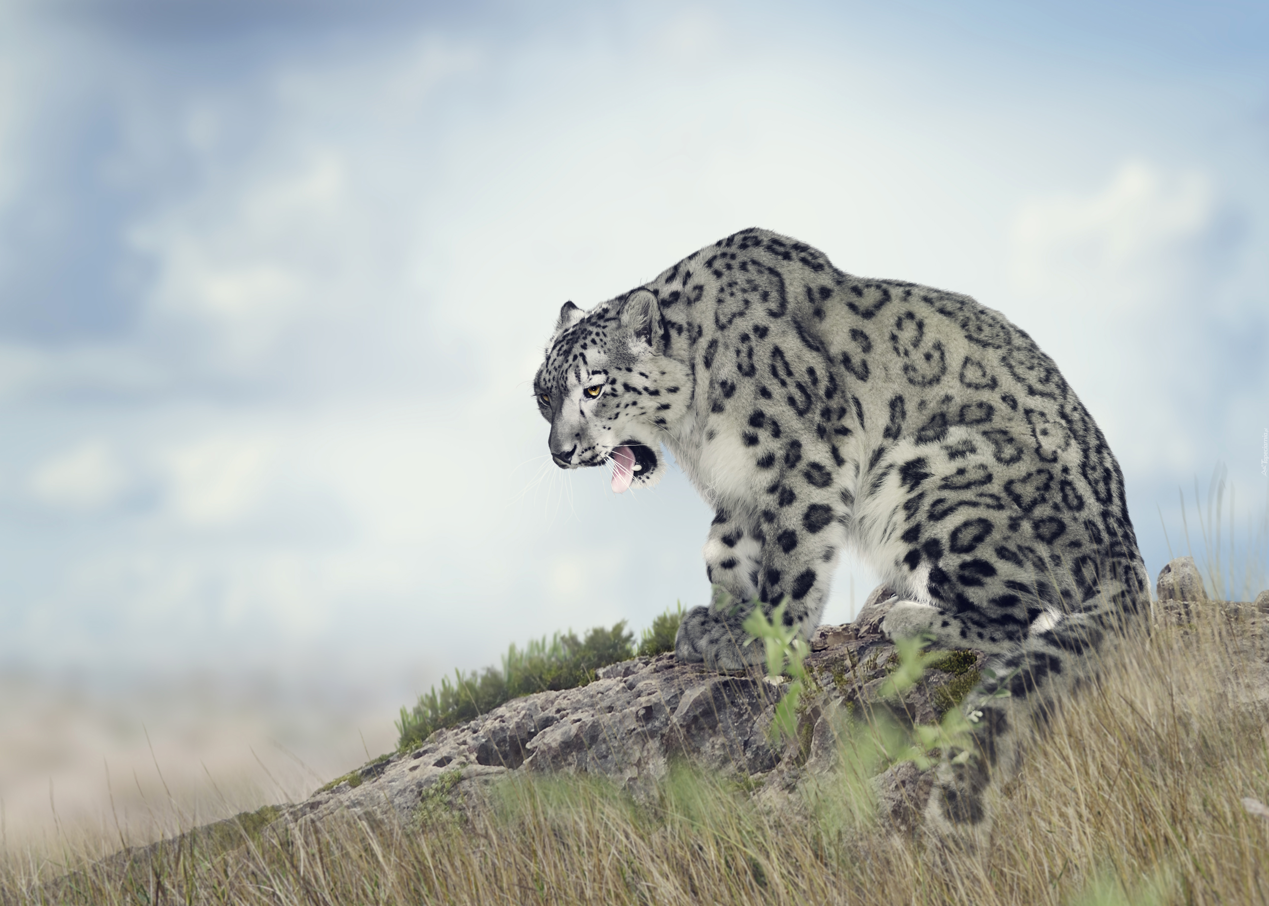 Edytor tapety: Ryczący irbis na trawiastym wzgórzu