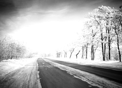 Edytor tapety: Asfaltowa droga wśród ośnieżonych drzew o świcie