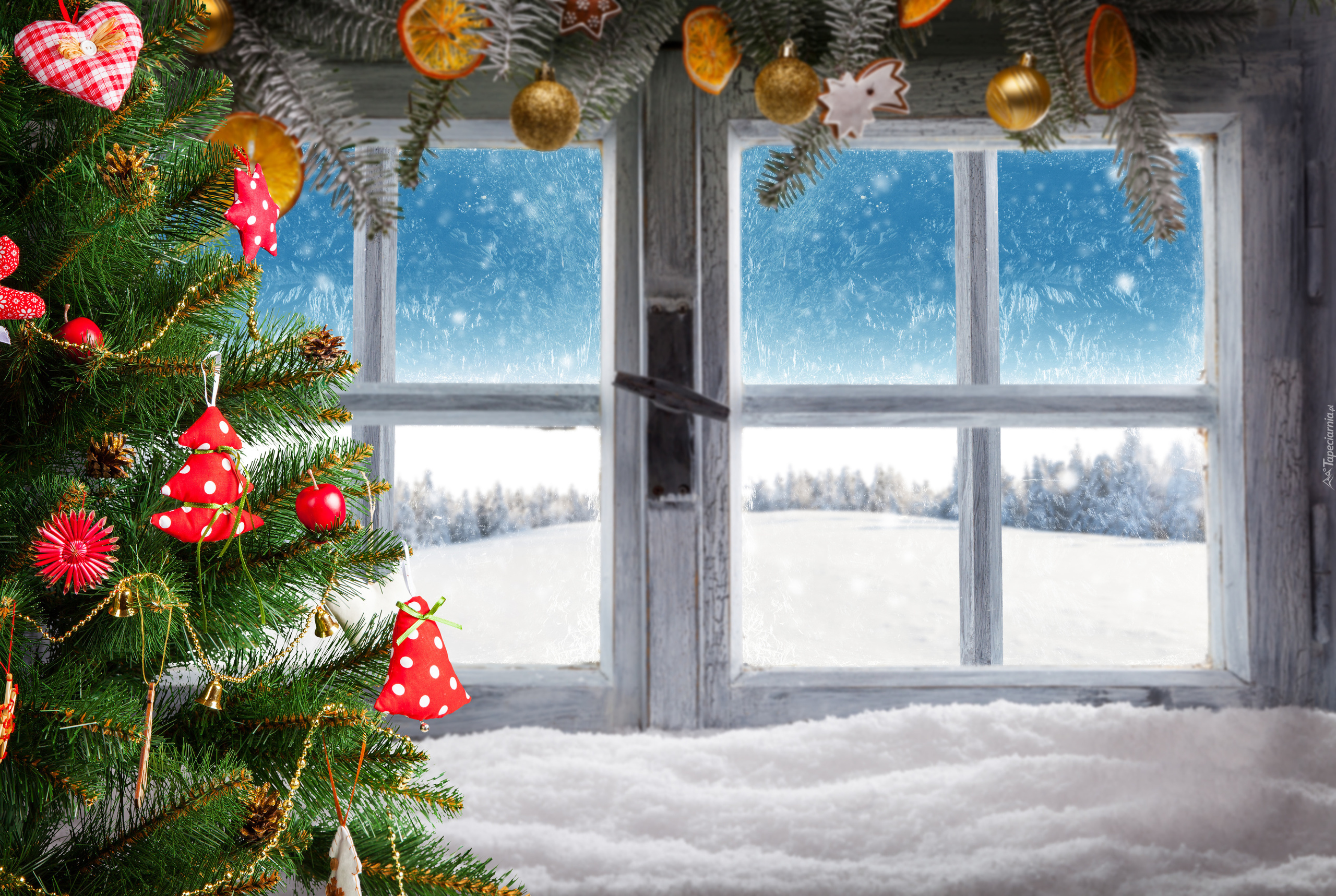 Edytor tapety: Świątecznie przystrojone okno z widokiem na ośnieżony pagórek