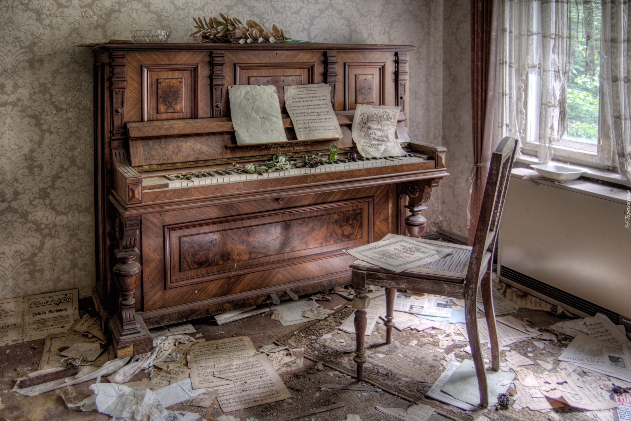 Edytor tapety: Bałagan w z zniszczonym pokoju z pianinem