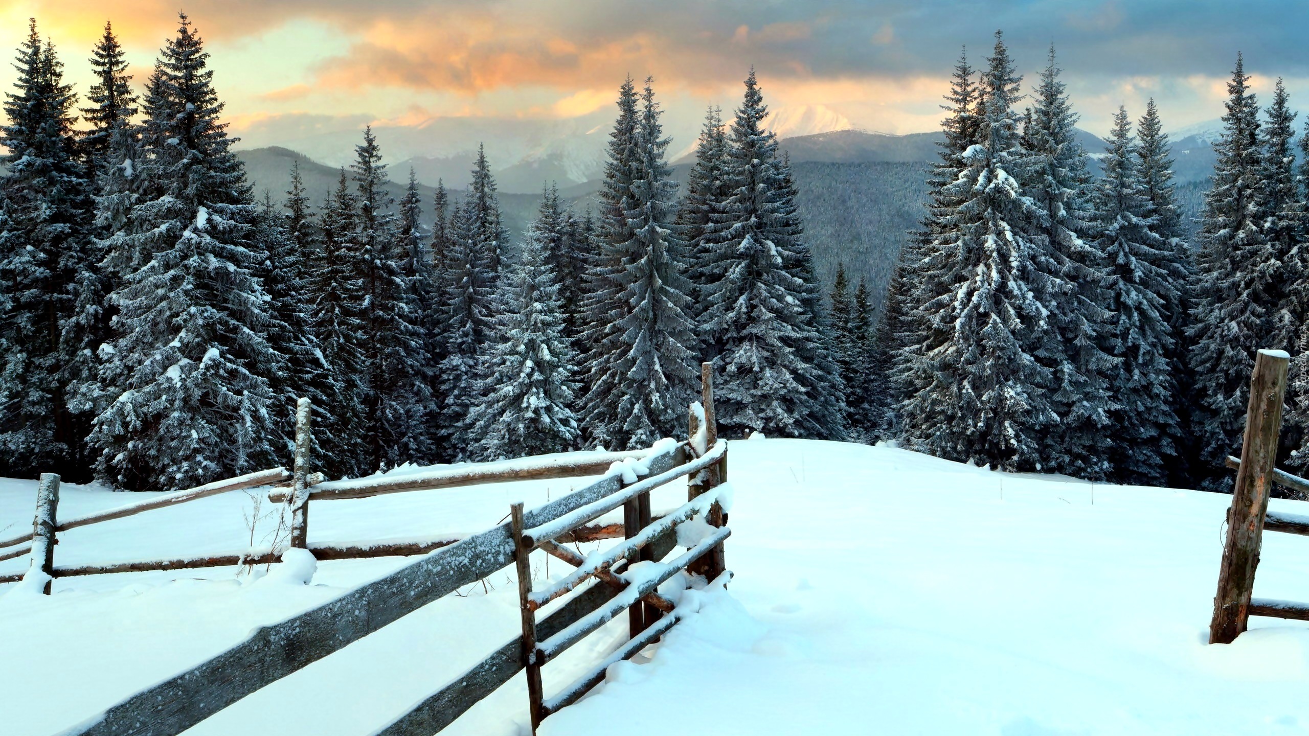Edytor tapety: Ośnieżony las w górach i ogrodzenie na polanie