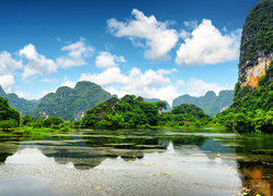 Edytor tapety: Jezioro w otoczeniu gór i lasu