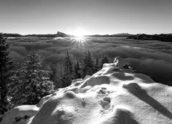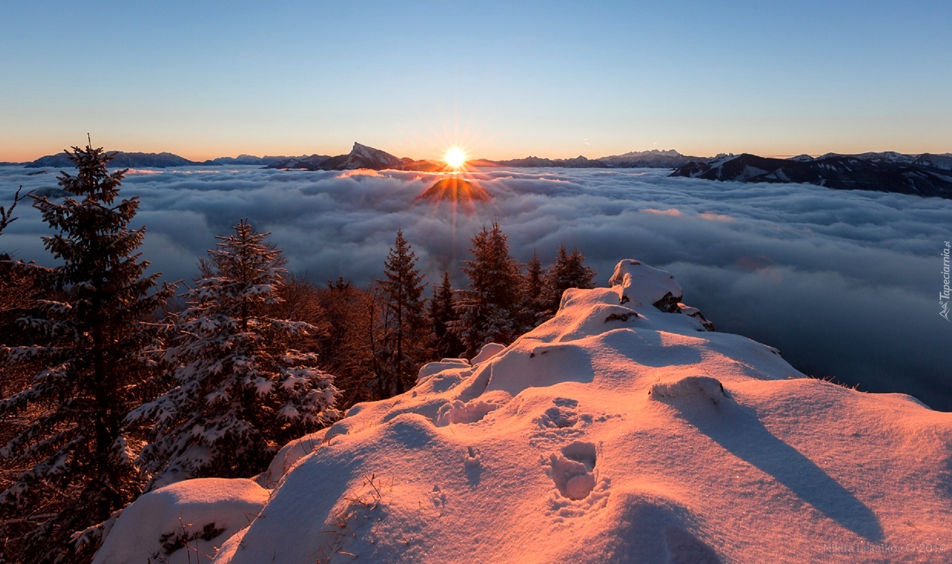 Edytor tapety: Zachód słońca nad zimowym lasem i opadająca mgła