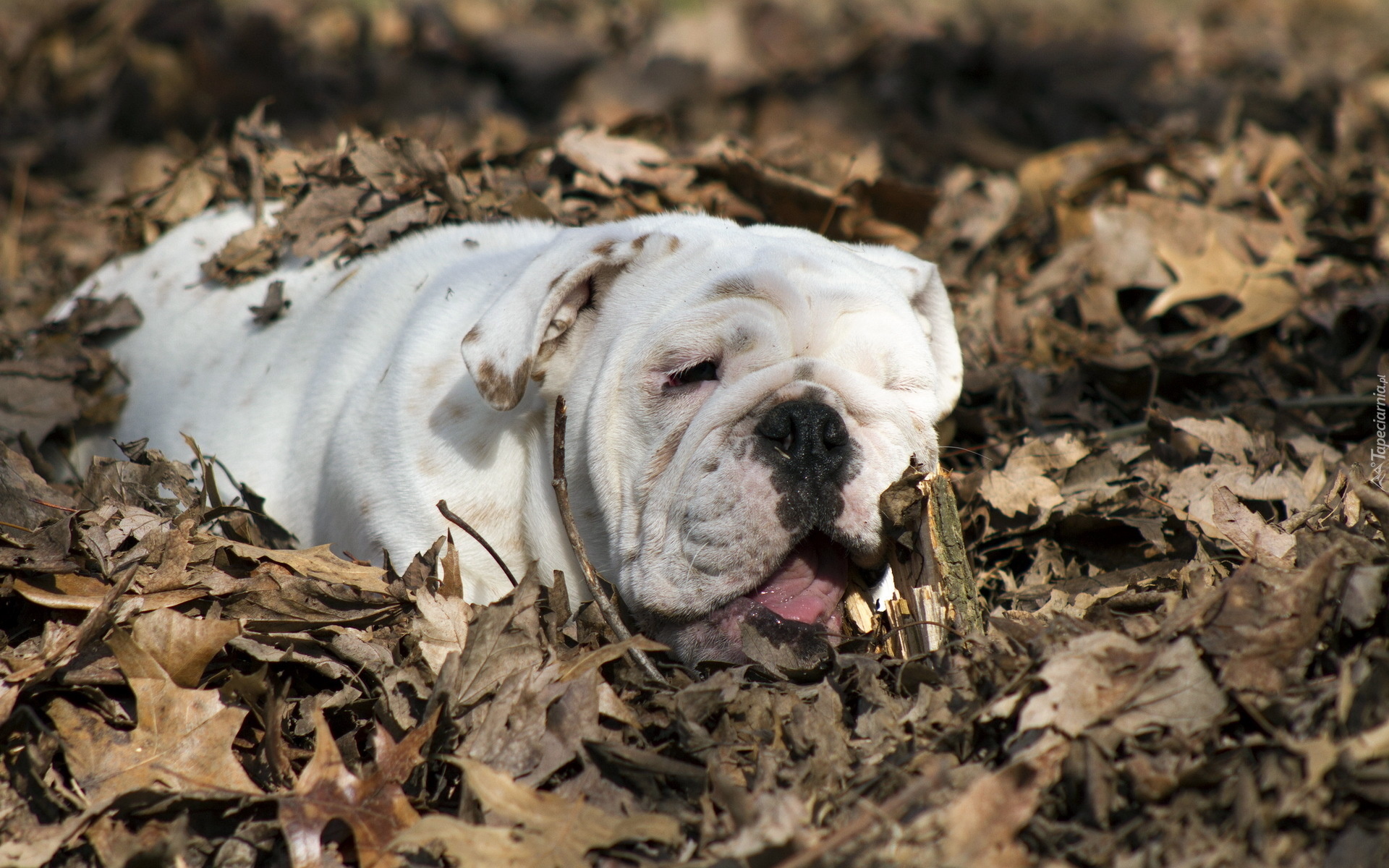 Edytor tapety: Buldog angielski odpoczywa zagrzebany w liściach