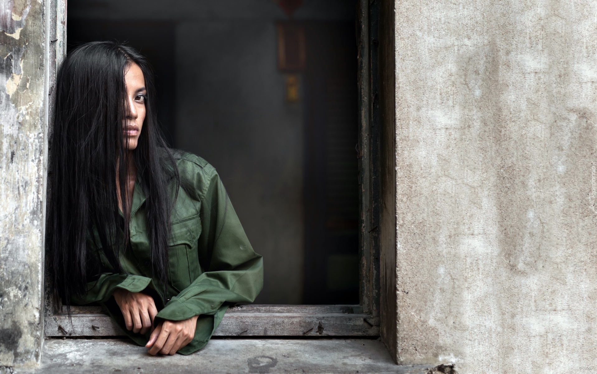 Edytor tapety: Dziewczyna o długich włosach spogląda przez okno