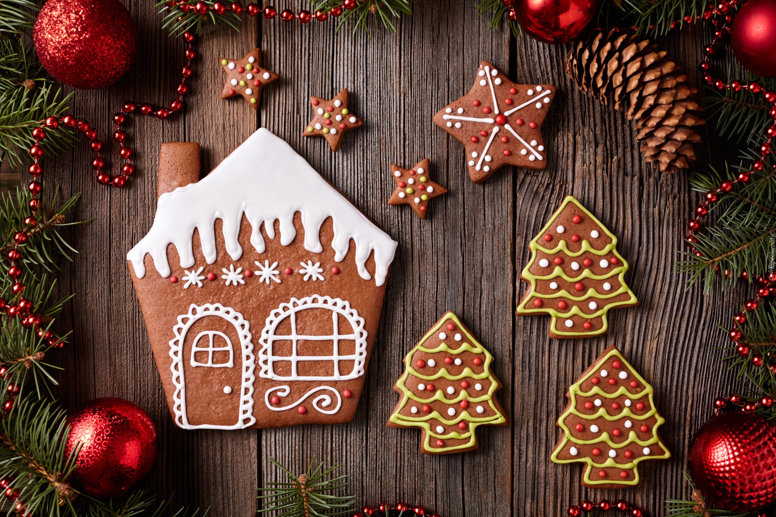 Edytor tapety: Dekoracja z świątecznymi piernikami i bombkami