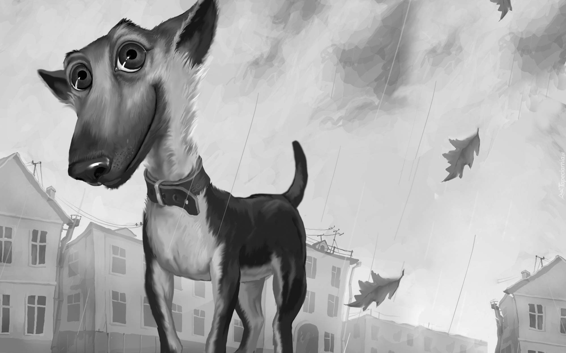 Edytor tapety: Rysunkowe miasteczko i fantazyjny pies