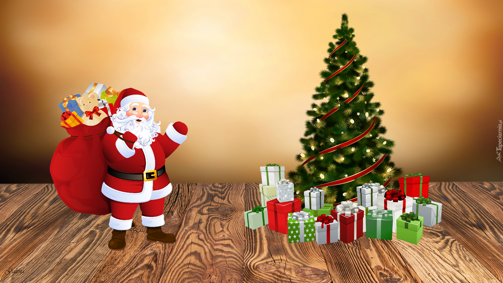 Edytor tapety: Mikołaj z workiem prezentów przy choince