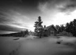 Edytor tapety: Domek w zimowej szacie na skraju lasu o zmierzchu