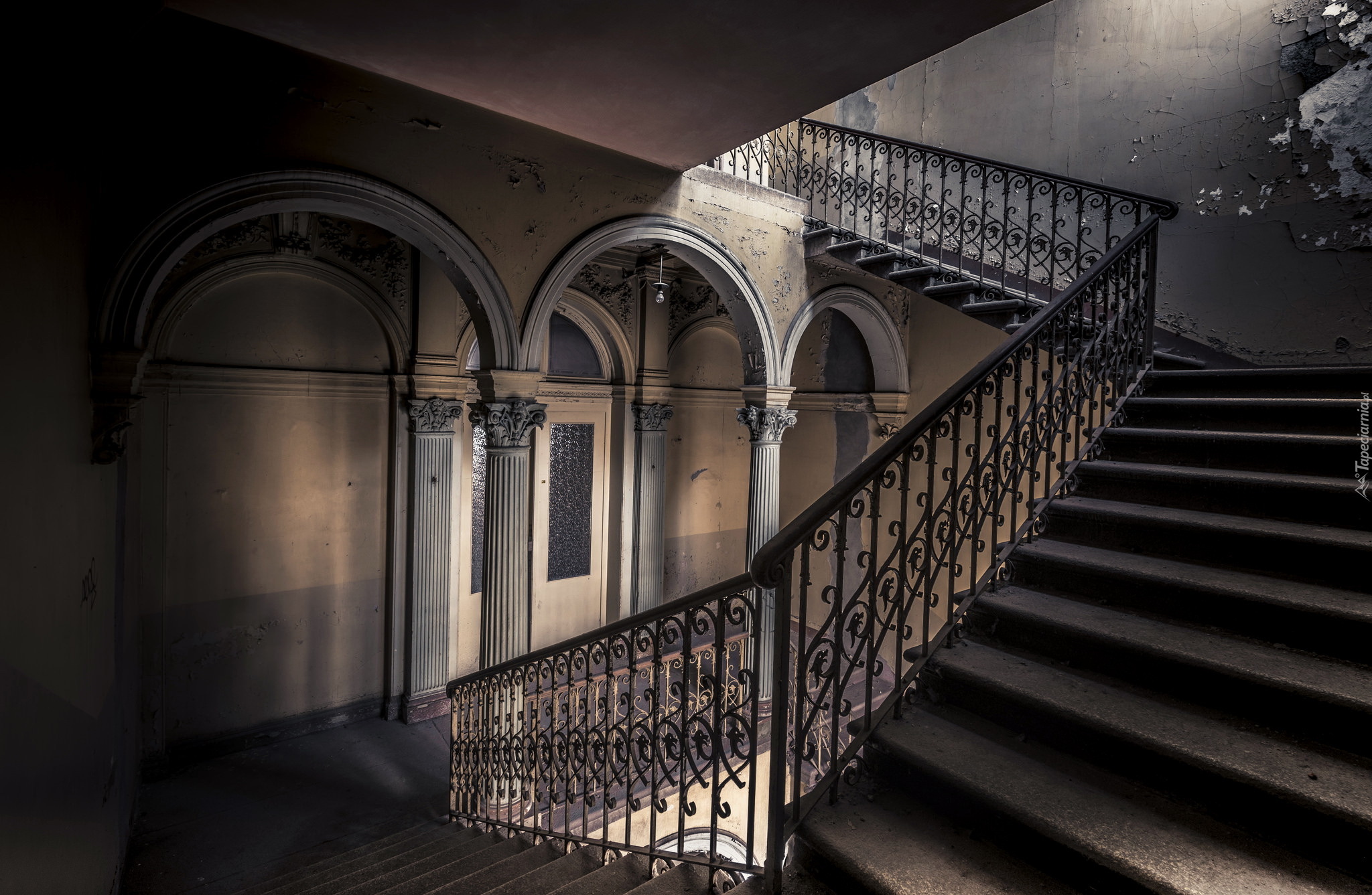 Edytor tapety: Stare zabytkowe wnętrze z schodami i balustradą