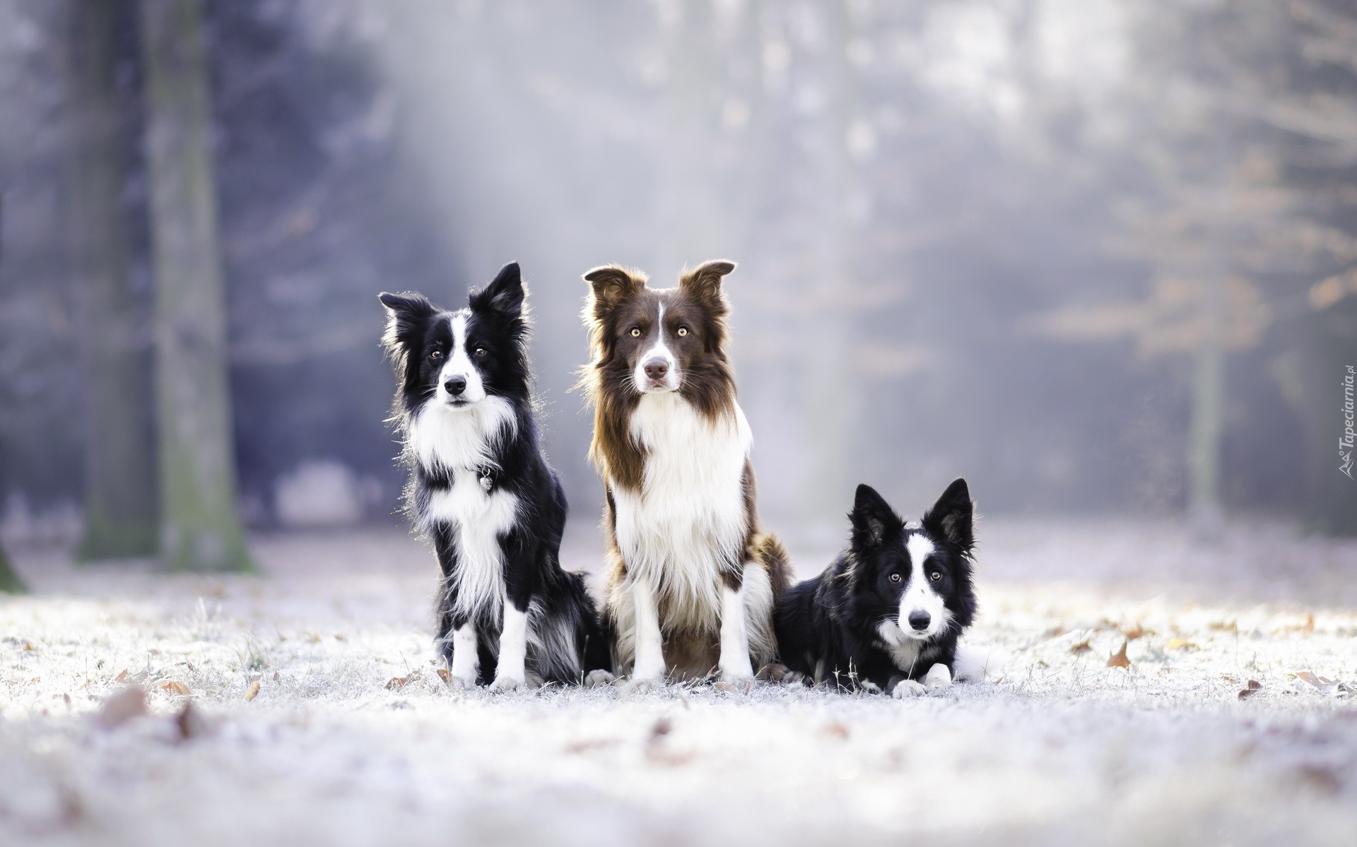 Edytor tapety: Trzy psy border collie na oszronionej leśnej łące