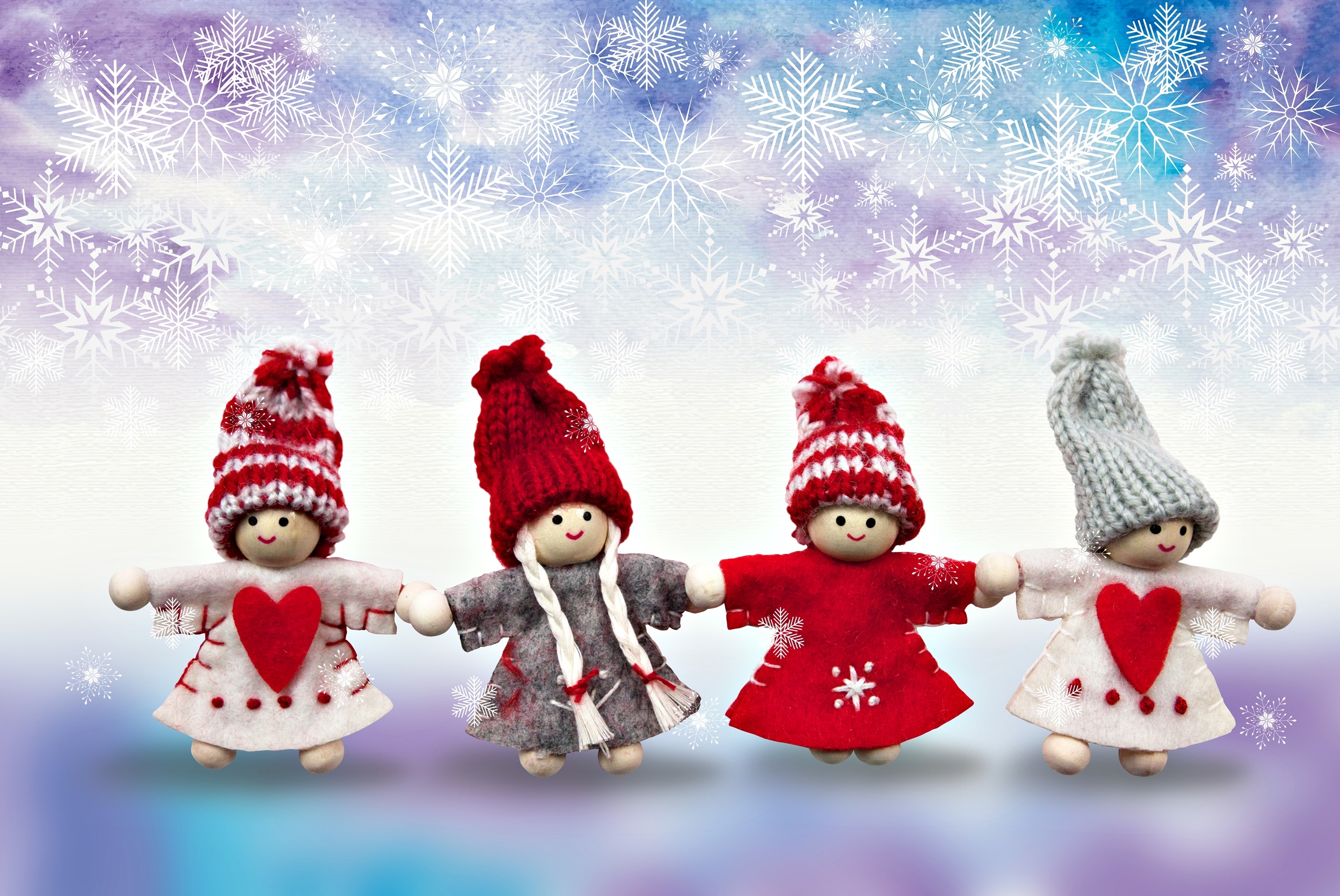 Edytor tapety: Świąteczne laleczki w ubrankach i wełnianych czapeczkach