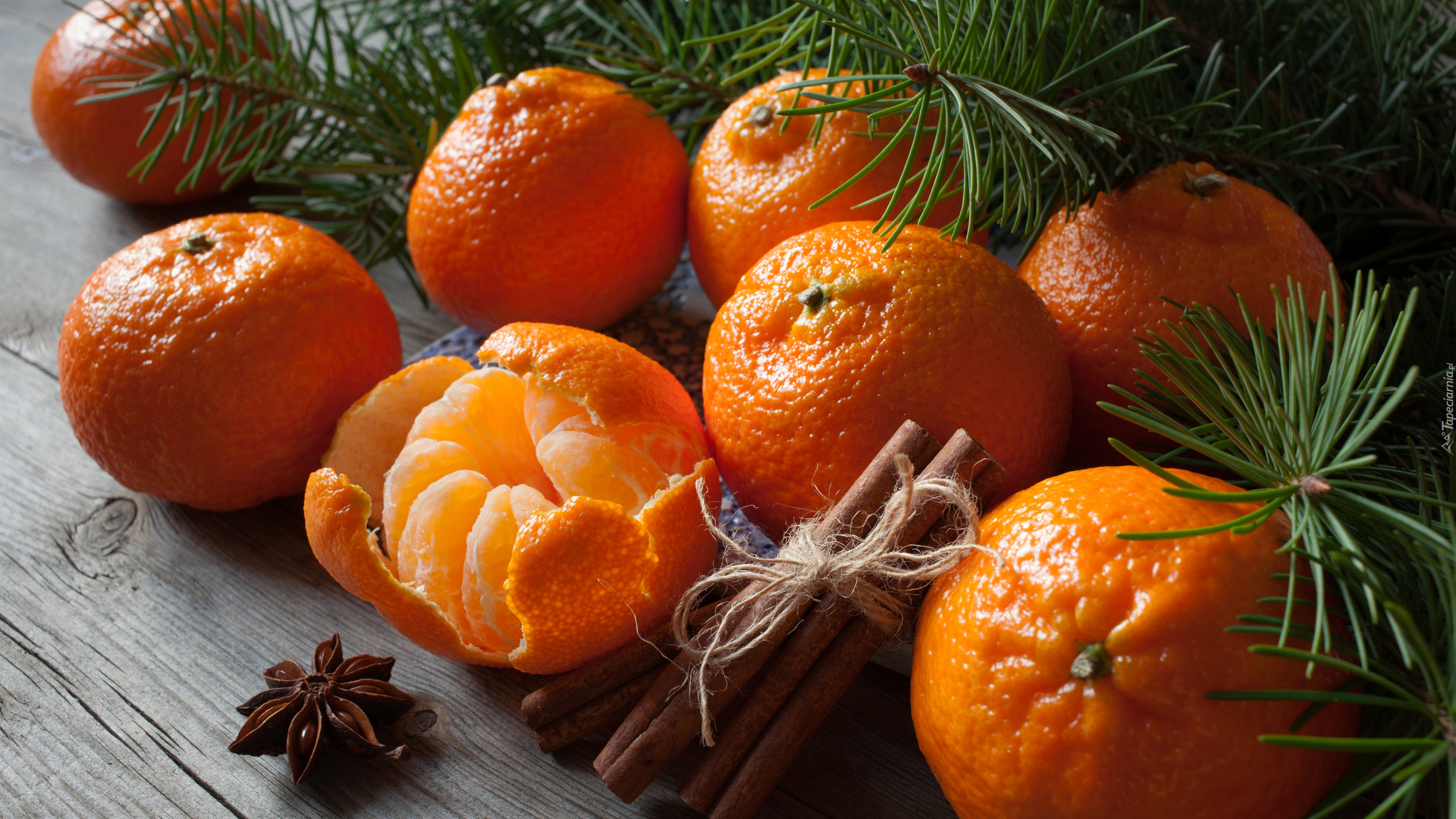 Edytor tapety: Mandarynki na świątecznym stole z laskami cynamonu