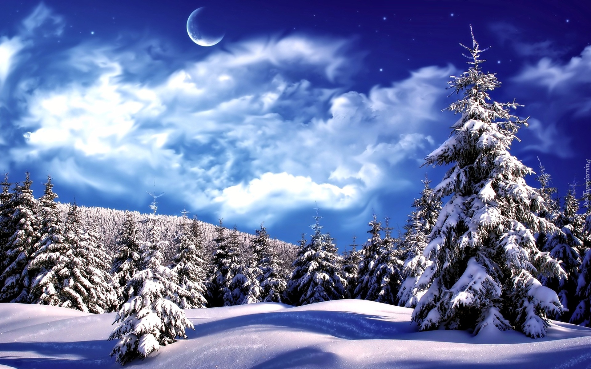 Edytor tapety: Chmury i księżyc nad lasem pokrytym śniegiem