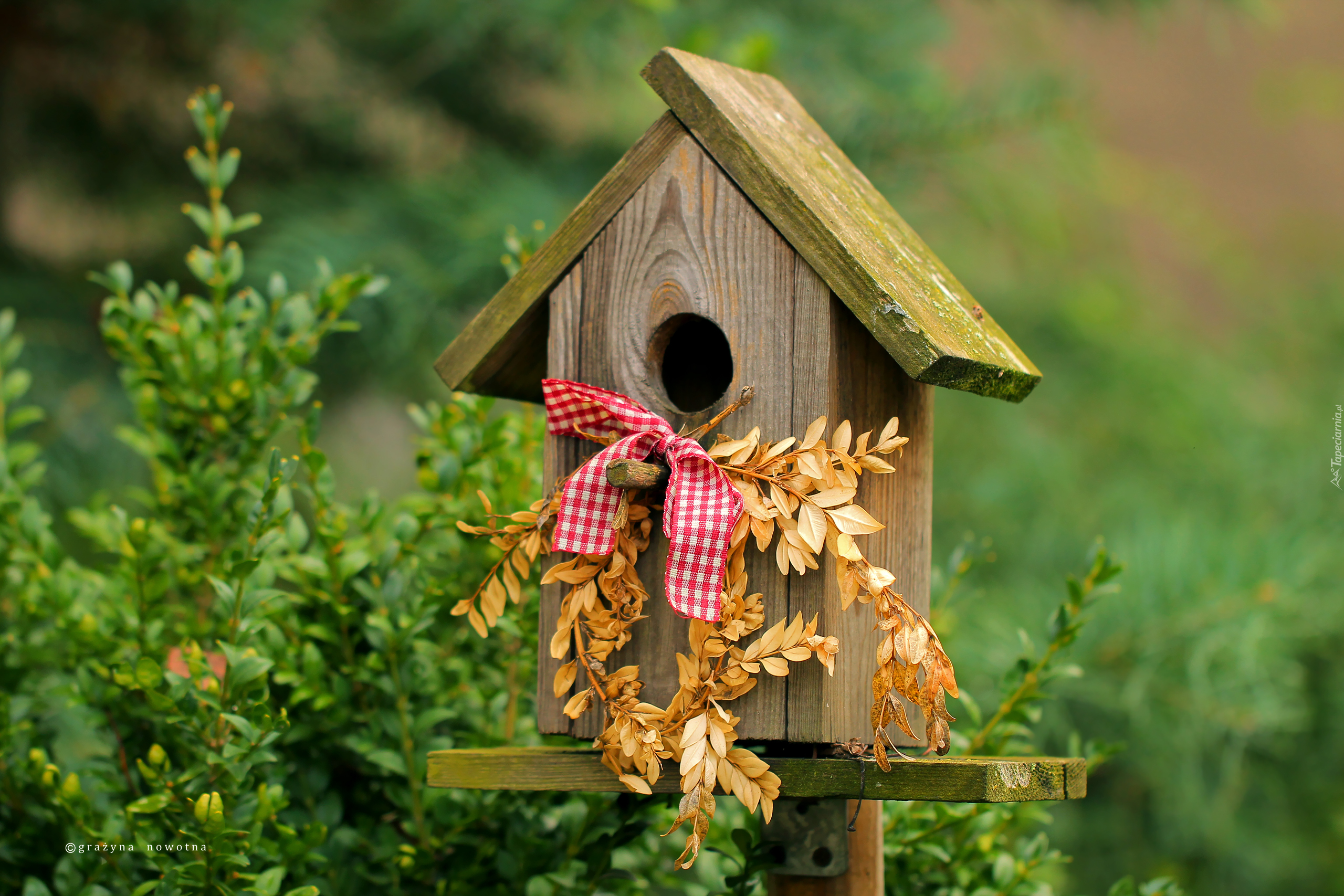 Edytor tapety: Karmnik dla ptaków ozdobiony suchymi roślinami i kokardą