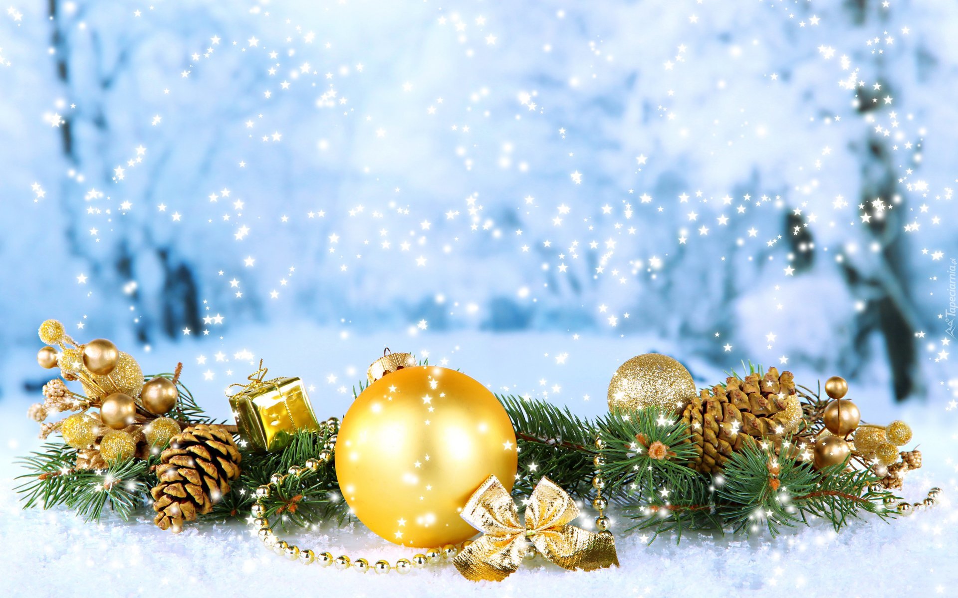 Edytor tapety: Stroik z bombkami i szyszkami ułożony na śniegu