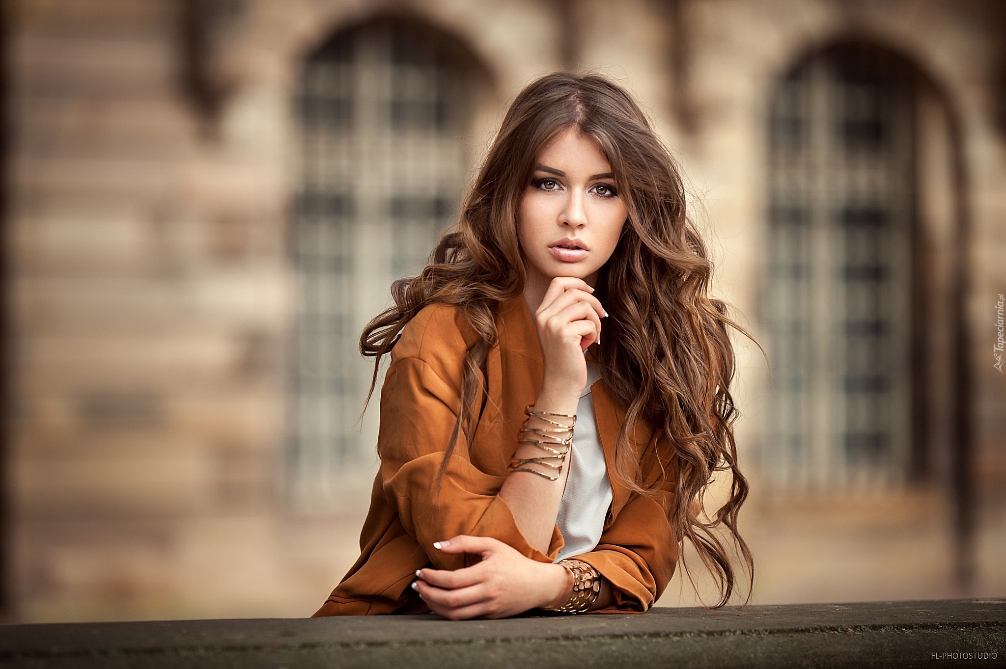 Edytor tapety: Długowłosa szatynka ze złotymi bransoletkami