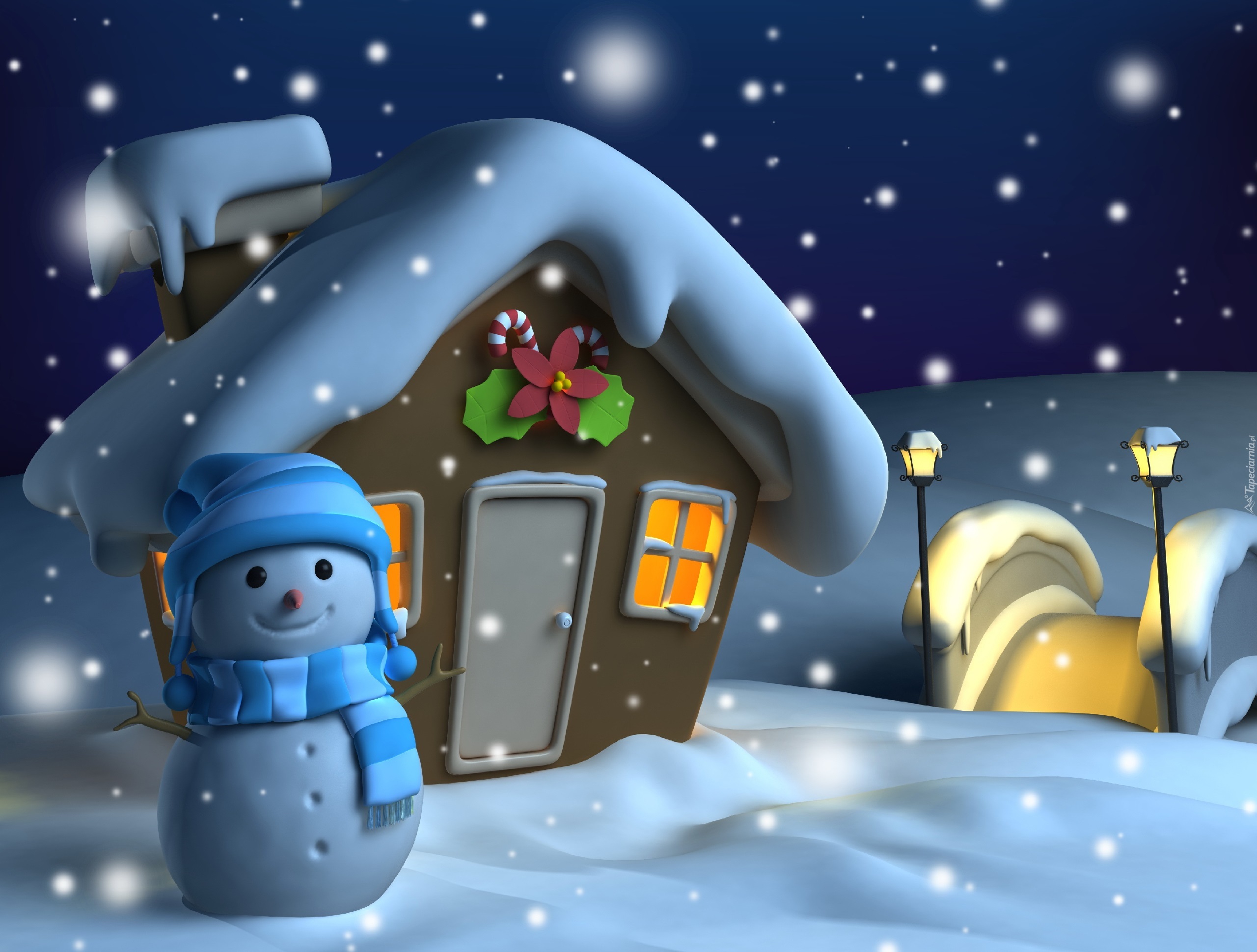 Edytor tapety: Zimowa grafika z bałwankiem obok domku