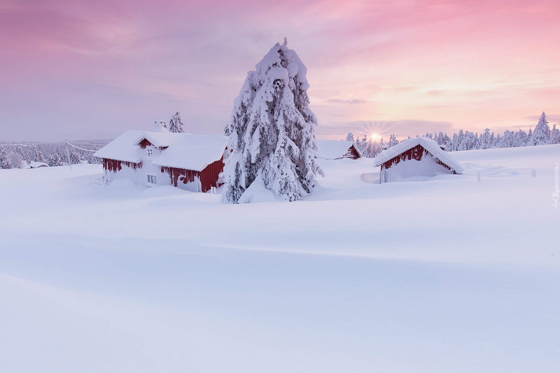 Edytor tapety: Domy i drzewa w polu zasypane śniegiem