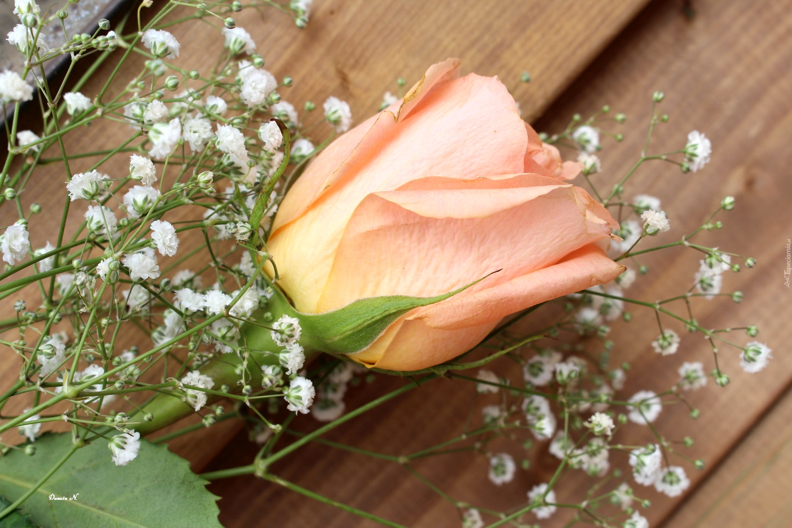 Edytor tapety: Herbaciana róża przybrana gipsówką