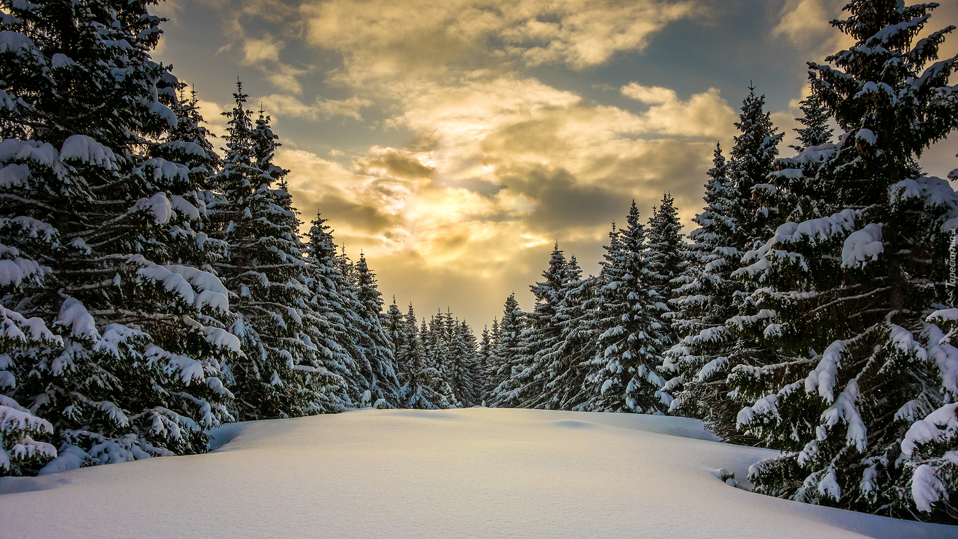 Edytor tapety: Ośnieżona polana otoczona drzewami