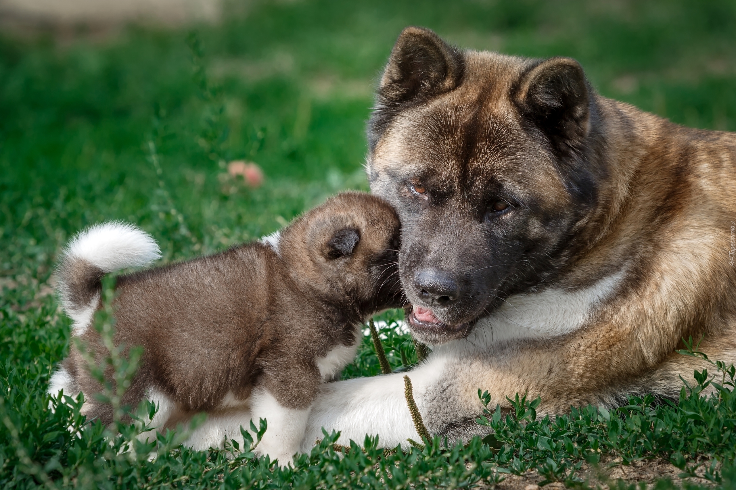 Edytor tapety: Szczeniak rasy akita amerykańska podczas zabawy z mamą