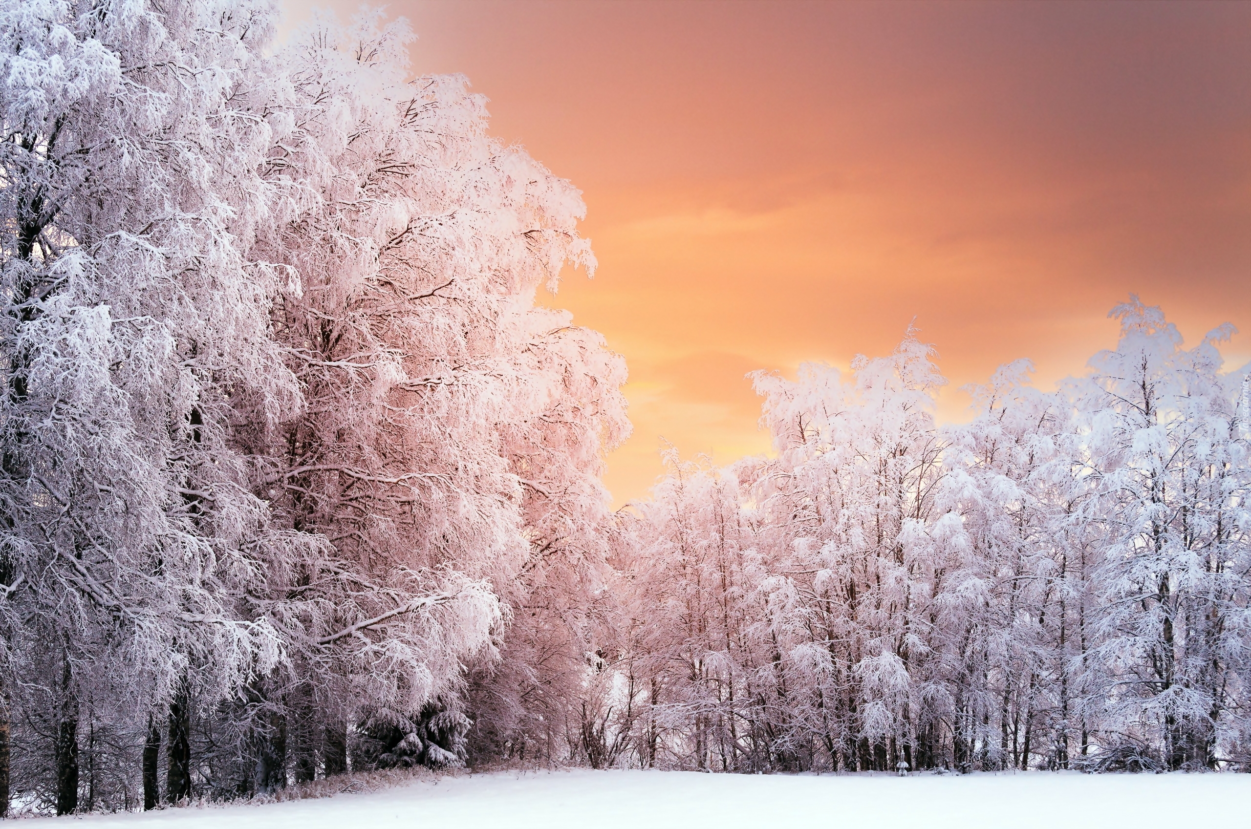 Edytor tapety: Ośnieżone drzewa w lesie i niebo malowane słońcem