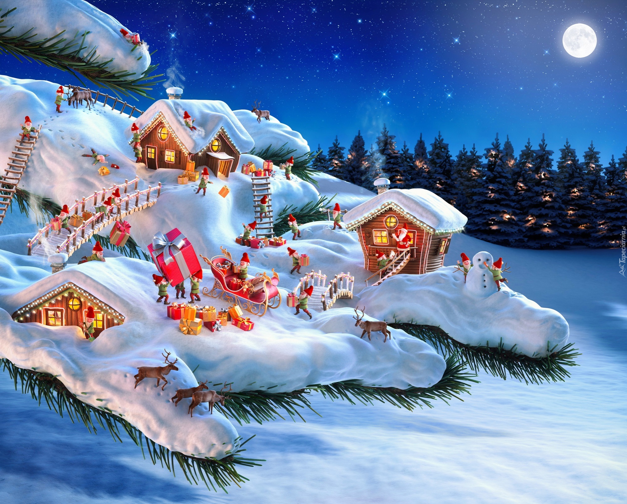 Edytor tapety: Skrzaty w zimowej krainie pakują prezenty