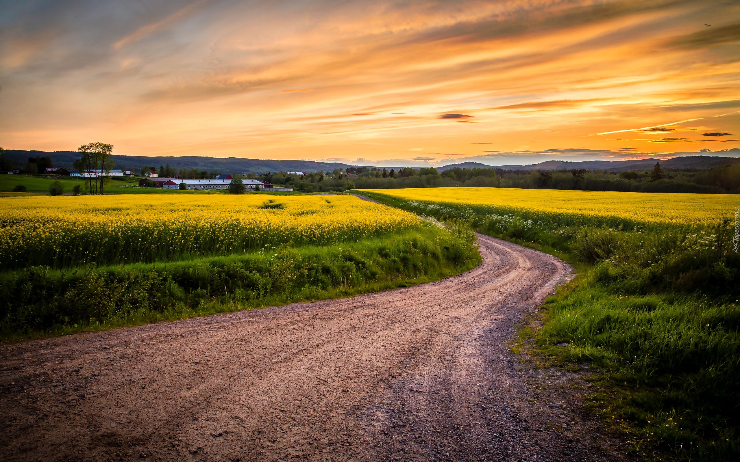 Edytor tapety: Droga wśród kwitnącego rzepaku prowadząca do zabudowań