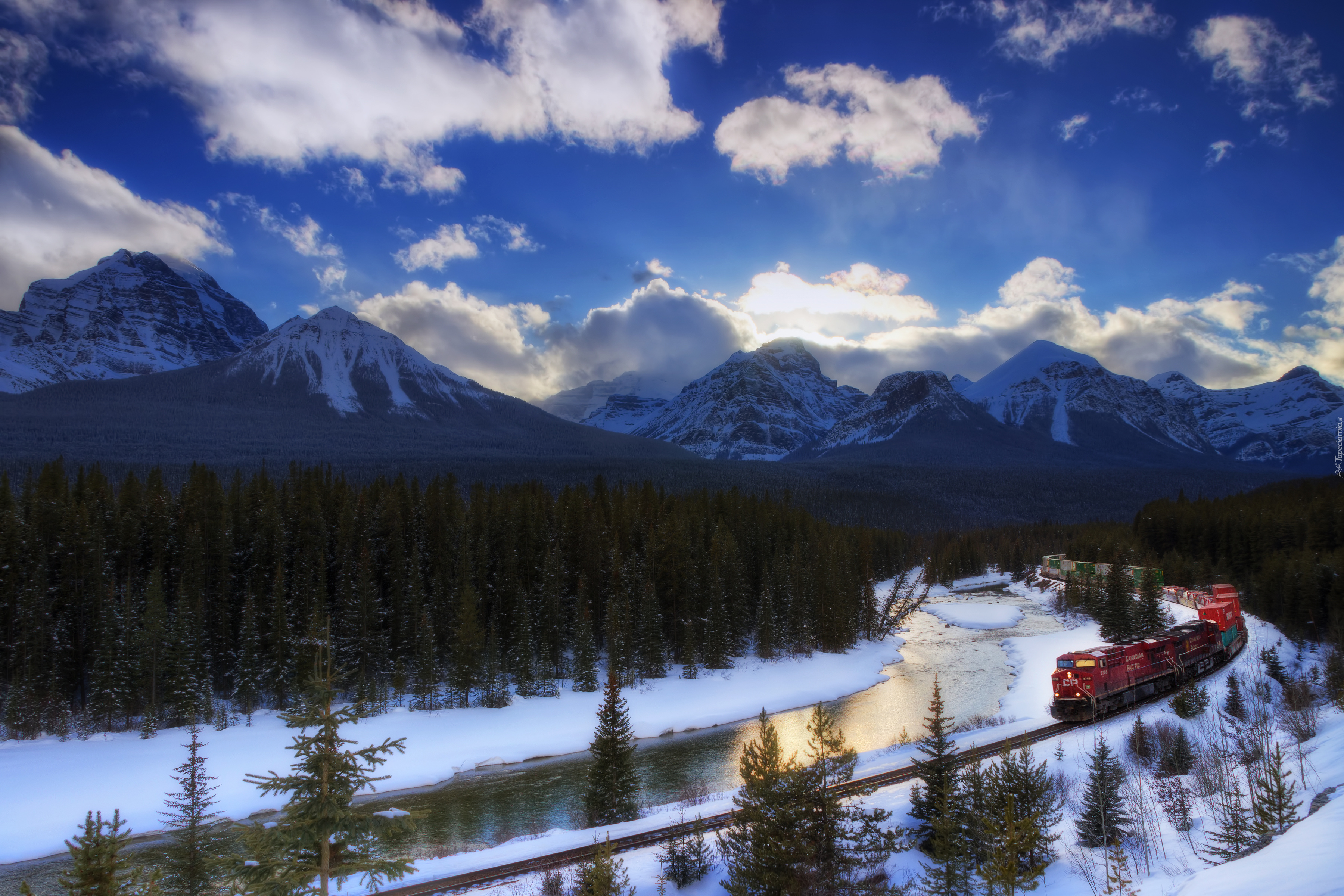 Edytor tapety: Pociąg na nasypie pomiędzy rzeką, lasem i górami