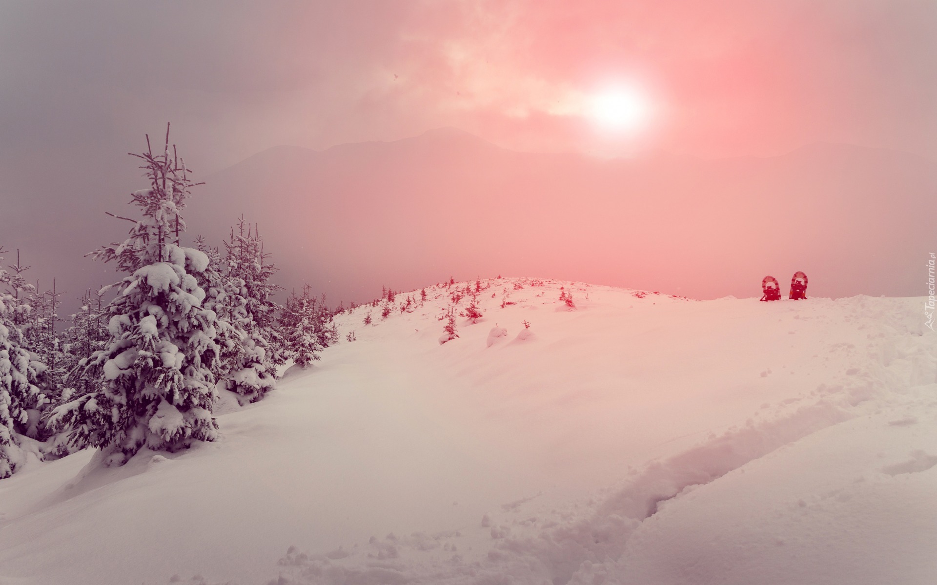 Edytor tapety: Świerki na ośnieżonym wzgórzu o świcie we mgle