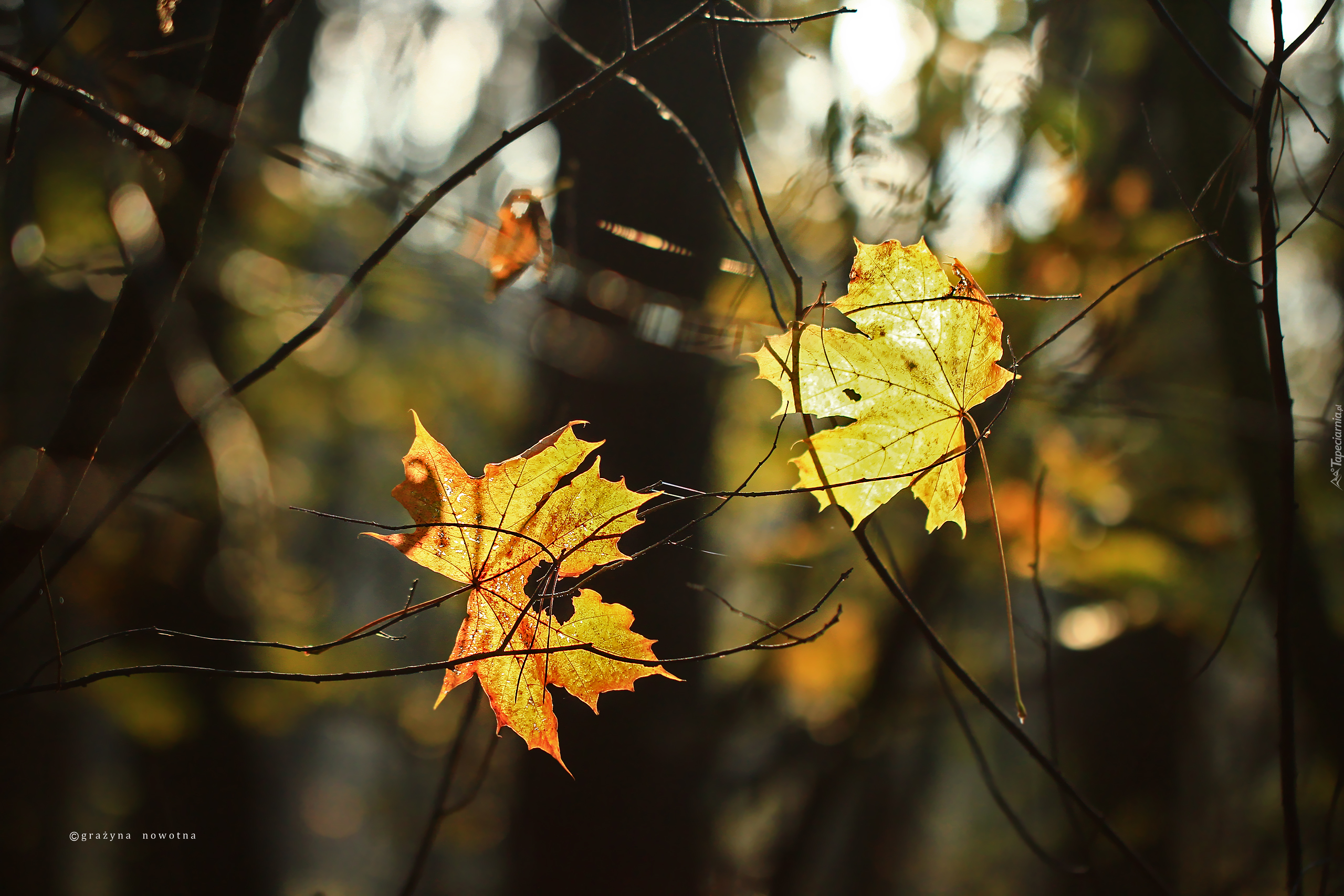 Edytor tapety: Dwa jesienne liście na gałązkach w świetle słońca