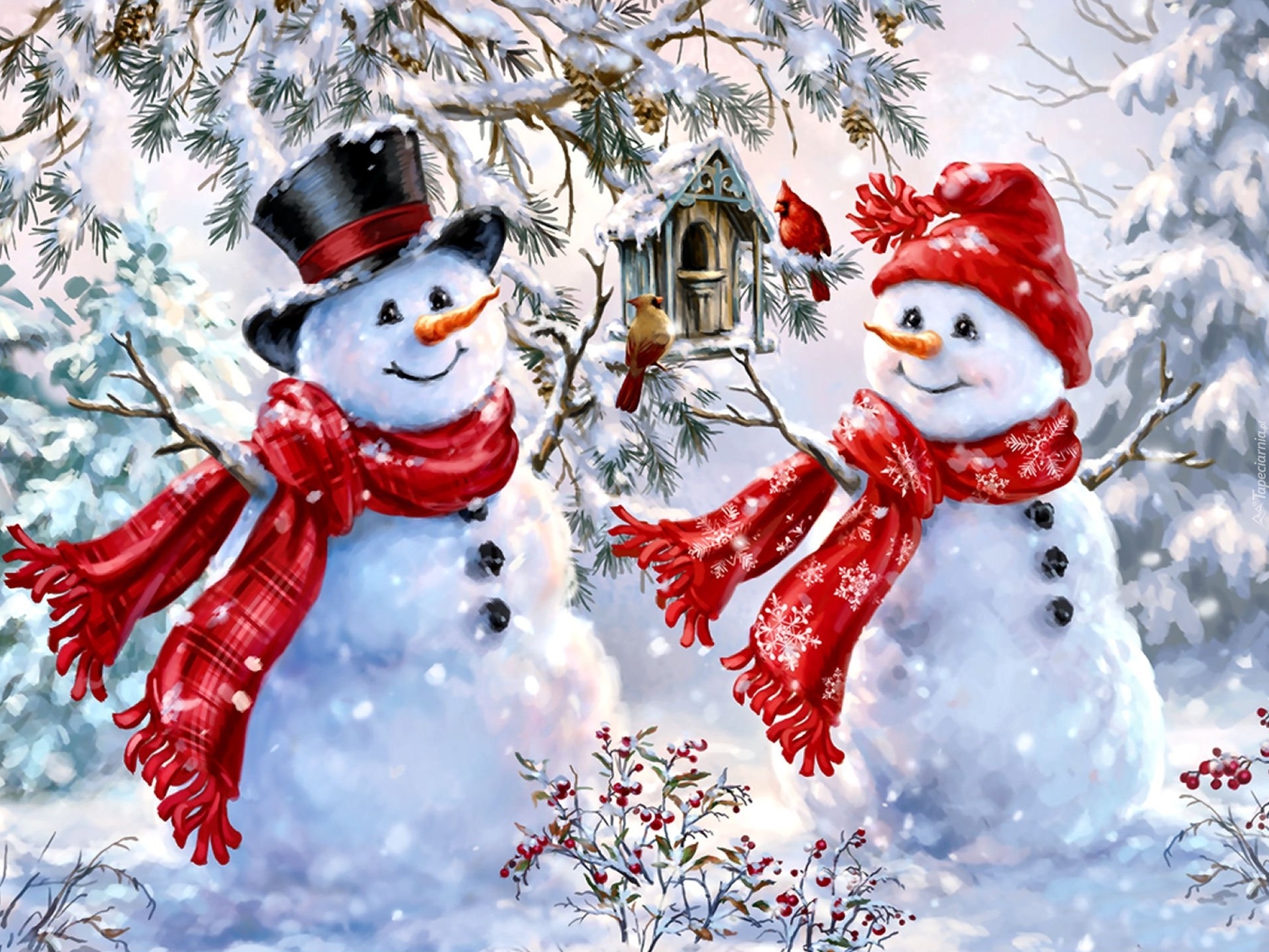 Edytor tapety: Radosne bałwanki przyglądają się ptaszkom w karmniku